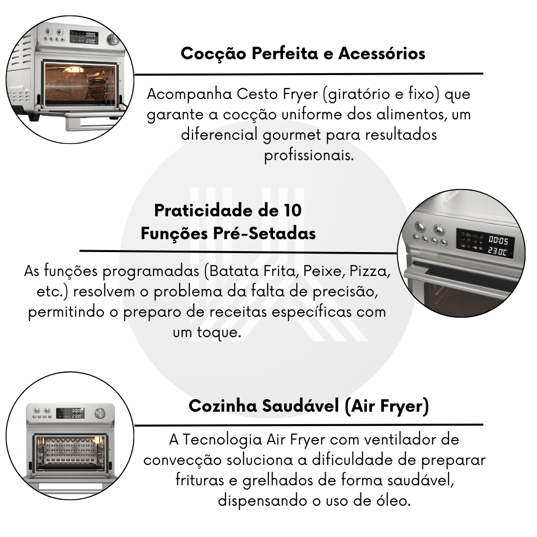 Cozinha Saudável (Air Fryer): A Tecnologia Air Fryer com ventilador de convecção soluciona a dificuldade de preparar frituras e grelhados de forma saudável, dispensando o uso de óleo.
