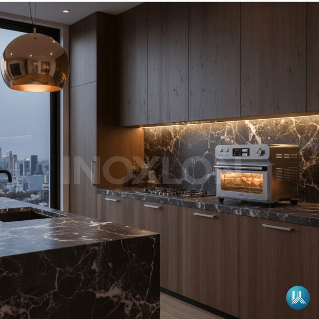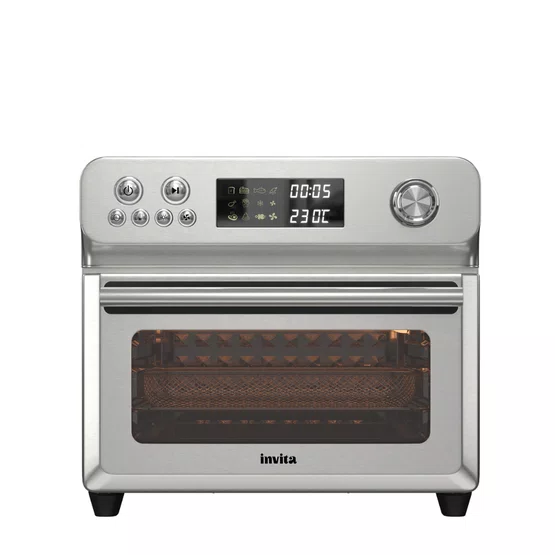 O Forno de Bancada Invita Air Fryer 24 Litros é a solução portátil de alto padrão que une a funcionalidade de um forno elétrico convencional com a moderna Tecnologia Air Fryer em um único equipamento. Ideal para ser instalado em bancadas de cozinhas e áreas gourmets, este forno soluciona o problema de preparar alimentos crocantes de forma saudável, sem a necessidade de adição de óleo ou fontes de gordura, graças ao seu ventilador de convecção de alta potência. Com 24 L de capacidade, ele é versátil para o preparo de inúmeras receitas. O grande diferencial são as 10 Funções pré-setadas (como Batata Frita, Peixe, Frango, Pizza e Steak), que garantem precisão e praticidade. Opera em uma faixa de temperatura versátil de v e conta com Vidro Duplo para maior segurança.