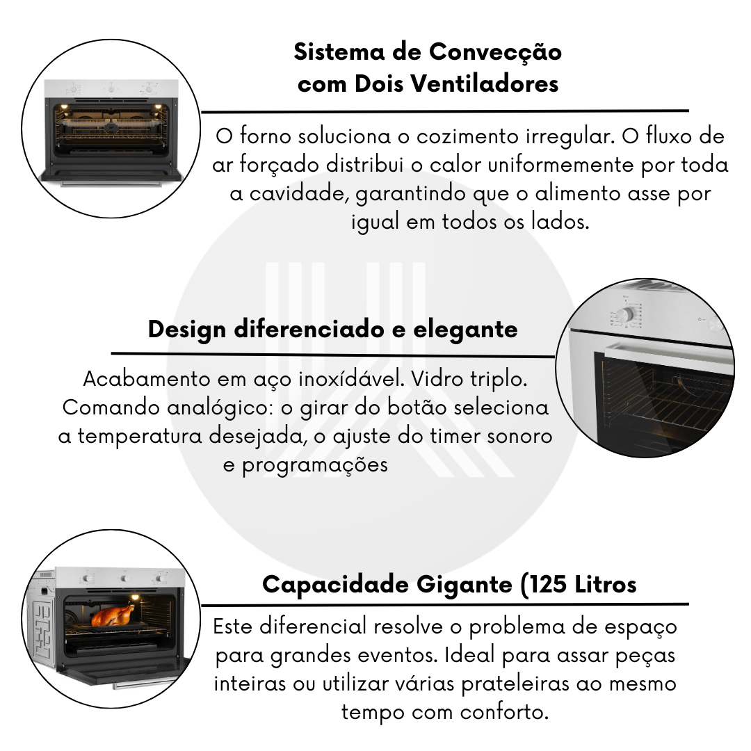 Capacidade Gigante (125 Litros): Este diferencial resolve o problema de espaço para grandes eventos. Ideal para assar peças inteiras ou utilizar várias prateleiras ao mesmo tempo com conforto.