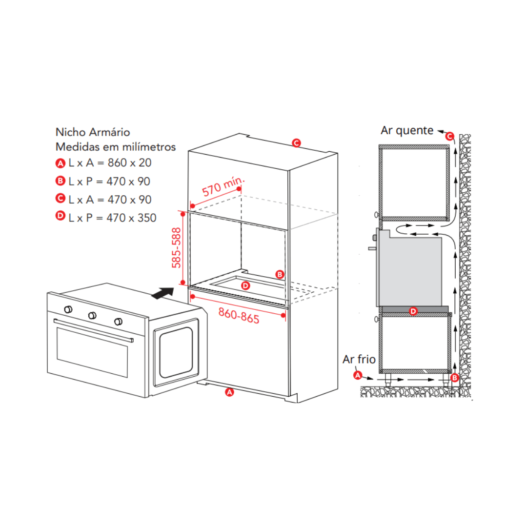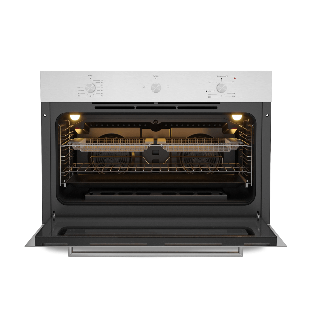 Sistema de Convecção com Dois Ventiladores: O forno soluciona o cozimento irregular. O fluxo de ar forçado distribui o calor uniformemente por toda a cavidade, garantindo que o alimento asse por igual em todos os lados.