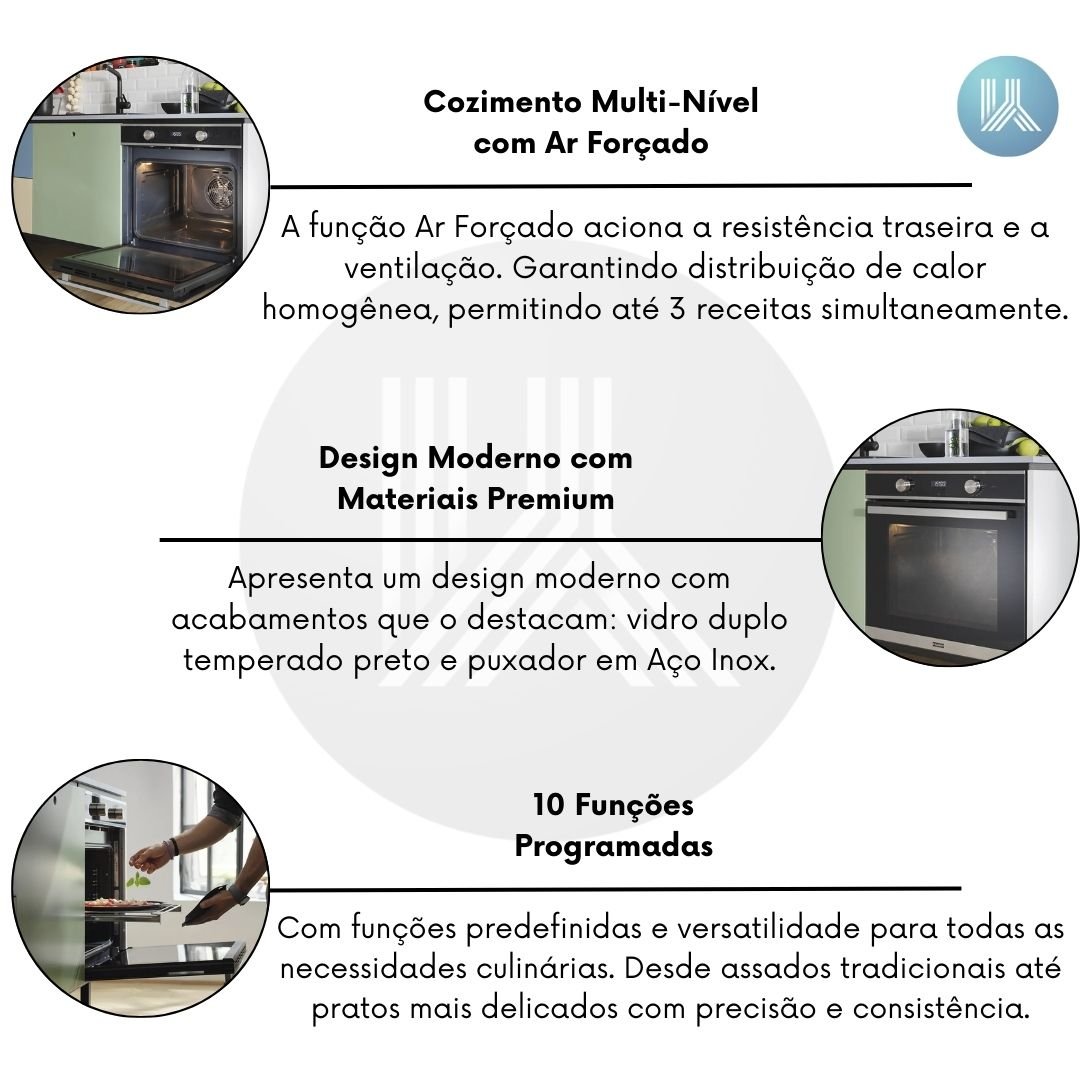 Com funções predefinidas, este forno oferece versatilidade para todas as necessidades culinárias. Inclui funções essenciais como Cozimento Ventilado, Grill para gratinar, Cozimento Combinado e Descongelamento Rápido, permitindo que você prepare desde assados tradicionais até pratos mais delicados com precisão e consistência.