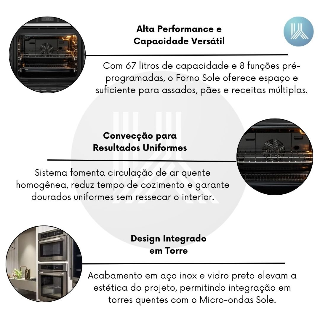 Acabamento em aço inox e vidro preto elevam a estética do projeto, permitindo integração em torres quentes com o Micro-ondas Sole. A porta com vidro triplo oferece isolamento térmico e segurança; o design embutido garante instalação limpa e alinhada ao móvel, entregando sofisticação e valorização do espaço. Componentes de alta qualidade asseguram durabilidade e baixo custo de manutenção, ideal para uso frequente em cozinhas gourmets.
