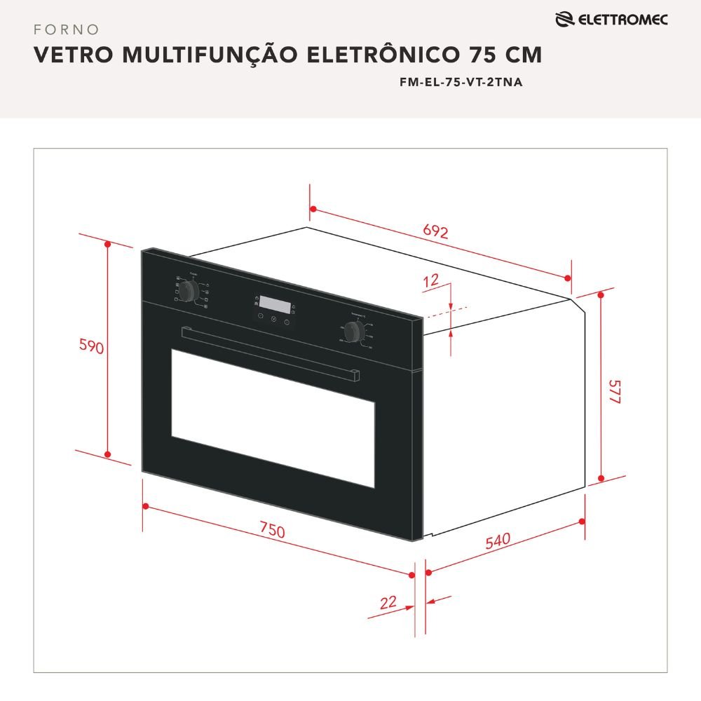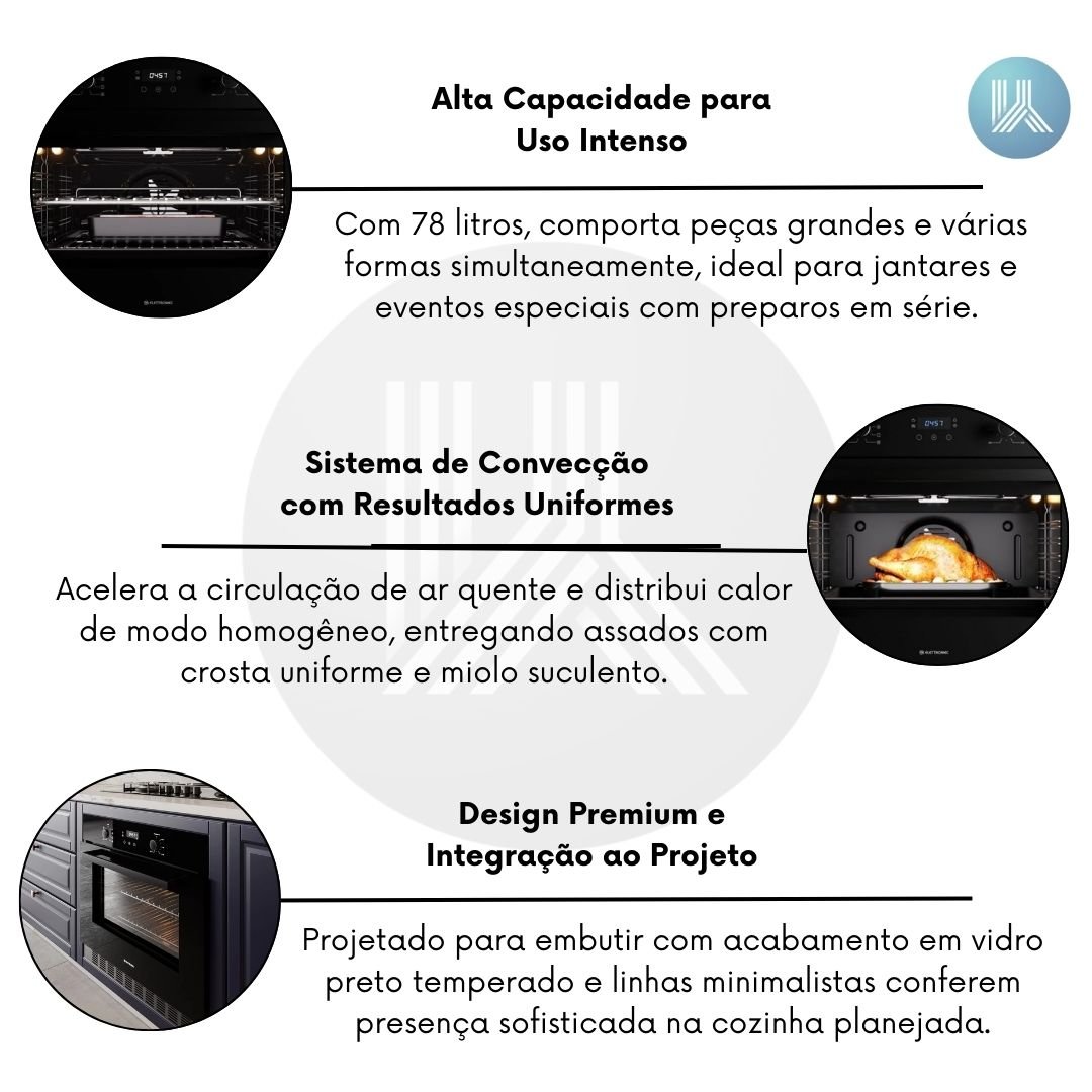 O Forno Vetro 75 cm reúne design em vidro preto temperado e desempenho profissional. Com 78 Litros, 12 programas, grill elétrico, porta tripla e convecção potente, oferece resultados rápidos e uniformes, painel digital e timers que garantem controle e segurança no preparo diário. Ideal para cozinhas planejadas que exigem desempenho, controle e robustez.