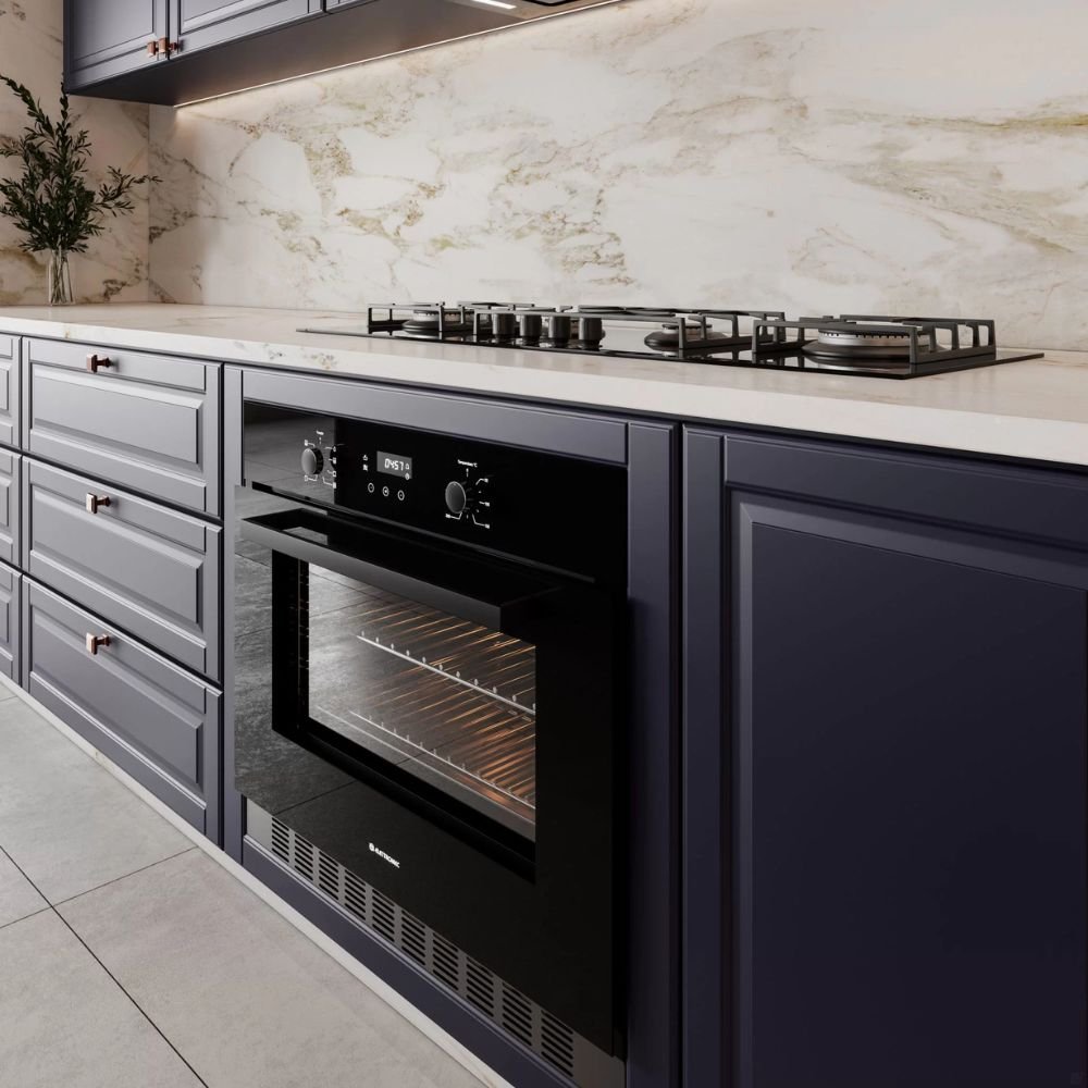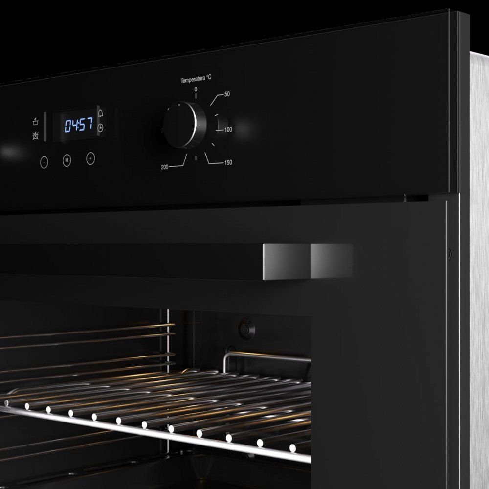 Acabamento em vidro preto temperado e linhas minimalistas conferem presença sofisticada na cozinha planejada. Projetado para embutir, harmoniza com torre de eletrodomésticos e agrega valor estético ao projeto. A porta com vidro triplo isola o calor e melhora segurança, enquanto o acabamento facilita a limpeza. Durabilidade comprovada.
