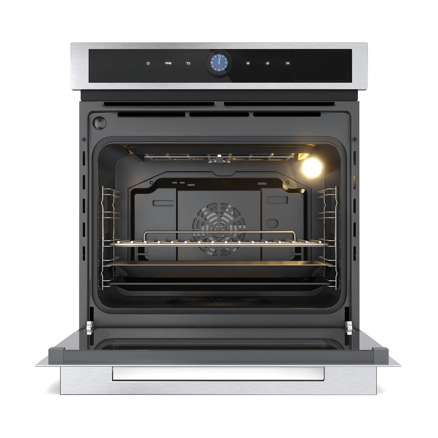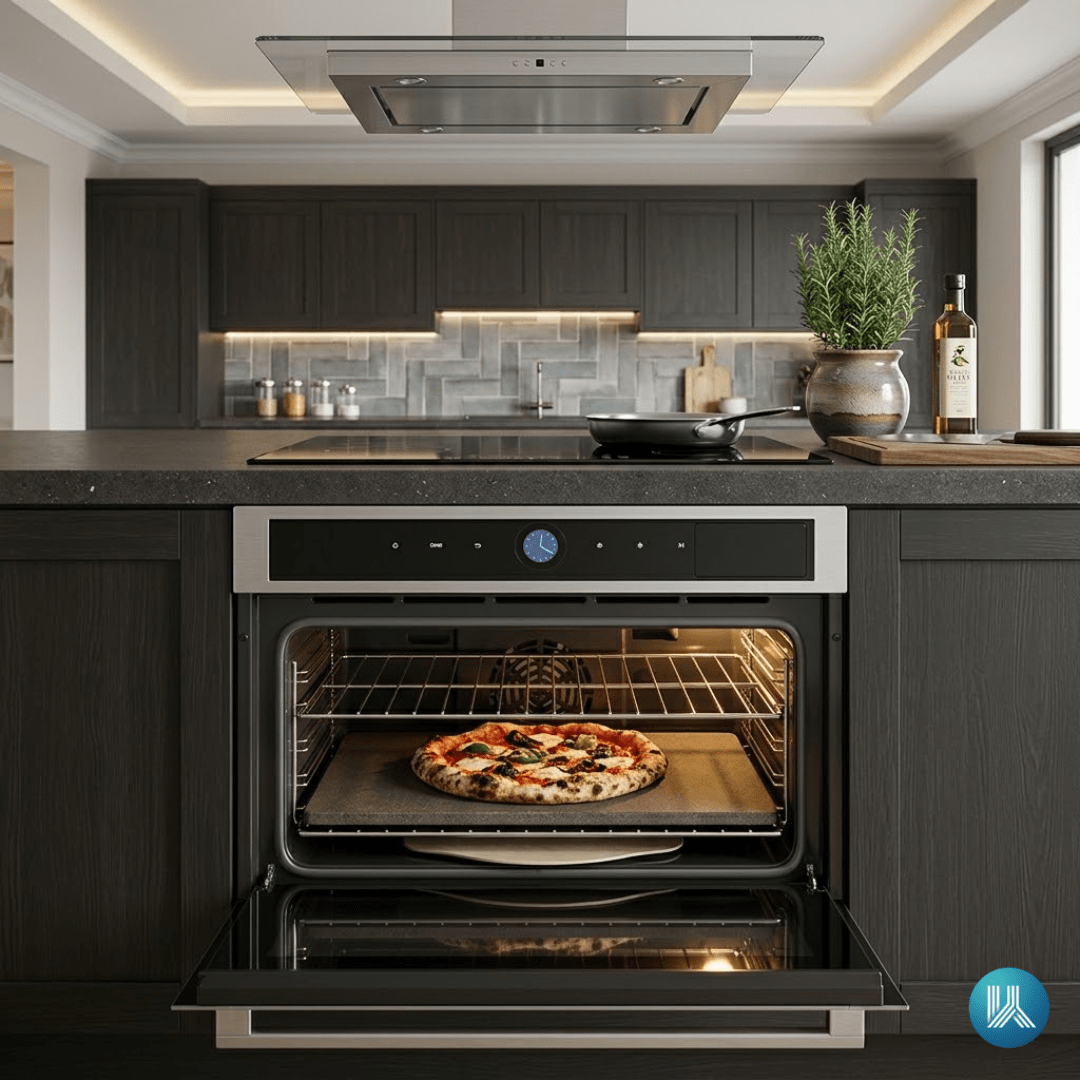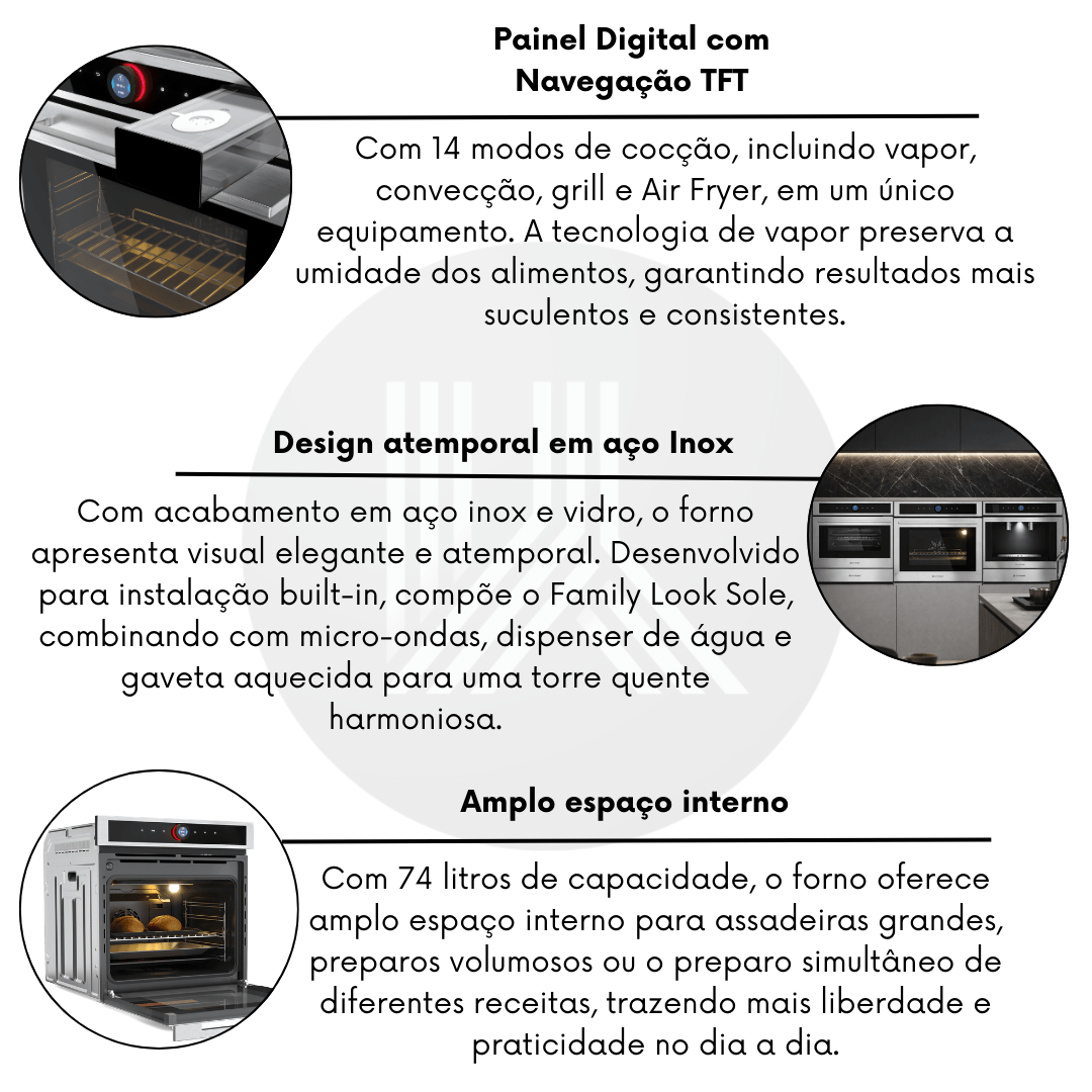 Painel Digital com Navegação TFT: O controle touch e manípulo intuitivo resolvem a complexidade técnica, oferecendo um manuseio tecnológico e sofisticado digno de uma cozinha premium.
