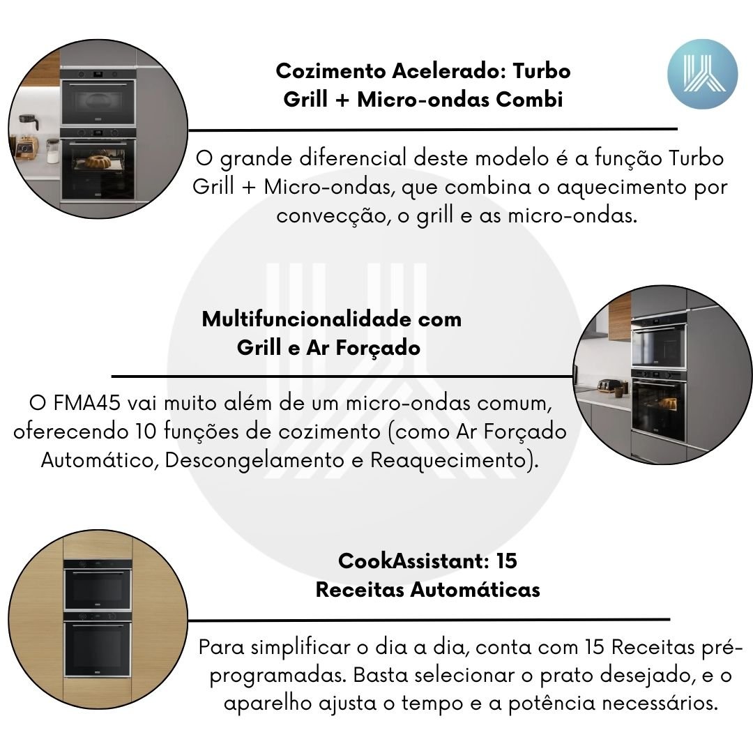 O FMA45 vai muito além de um micro-ondas comum, oferecendo 10 funções de cozimento (como Ar Forçado Automático, Descongelamento e Reaquecimento). A inclusão do Grill e do Sistema de Ar Forçado (Convecção) permite o cozimento Combi, garantindo que as refeições sejam preparadas com a mesma qualidade de um forno convencional, mas com a rapidez do micro-ondas.
