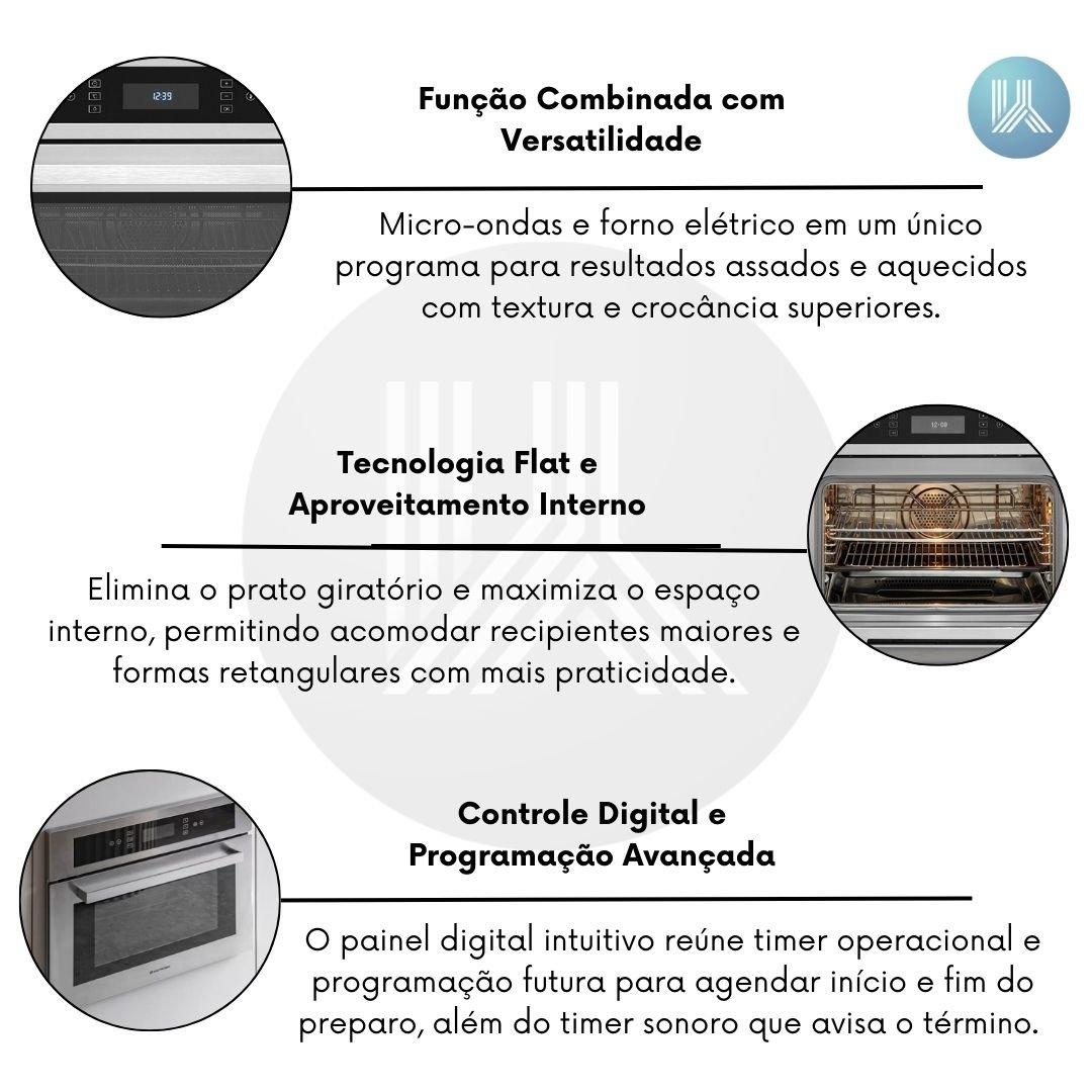 Combine micro-ondas e forno elétrico em um único programa com a Função Combinada para resultados assados e aquecidos com textura e crocância superiores. O grill elétrico garante dourado uniforme enquanto as 8 funções automáticas e 8 programas do forno adaptam-se a receitas variadas, do dia a dia a preparos gourmets exigentes. Ideal para quem busca praticidade sem abrir mão de acabamento profissional.