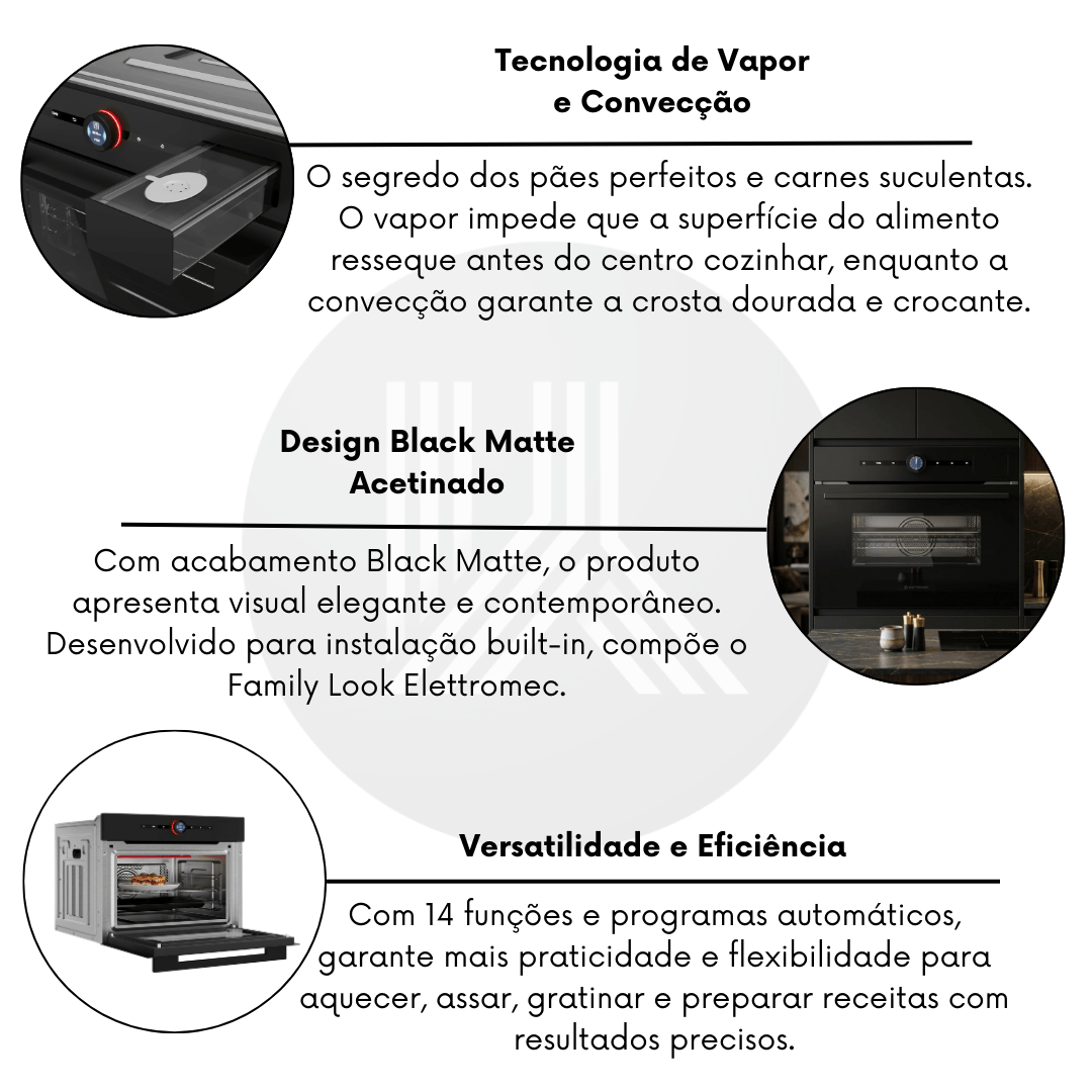 O Micro-ondas Elettromec Black Matte surge para solucionar essas limitações, apresentando o inovador Sistema Flat (sem prato giratório), que amplia o espaço útil e garante aquecimento uniforme. Com tecnologia tripla — micro-ondas, convecção e vapor — ele permite assar, gratinar e cozinhar de forma saudável, entregando o status e a performance premium que o seu projeto de luxo exige.