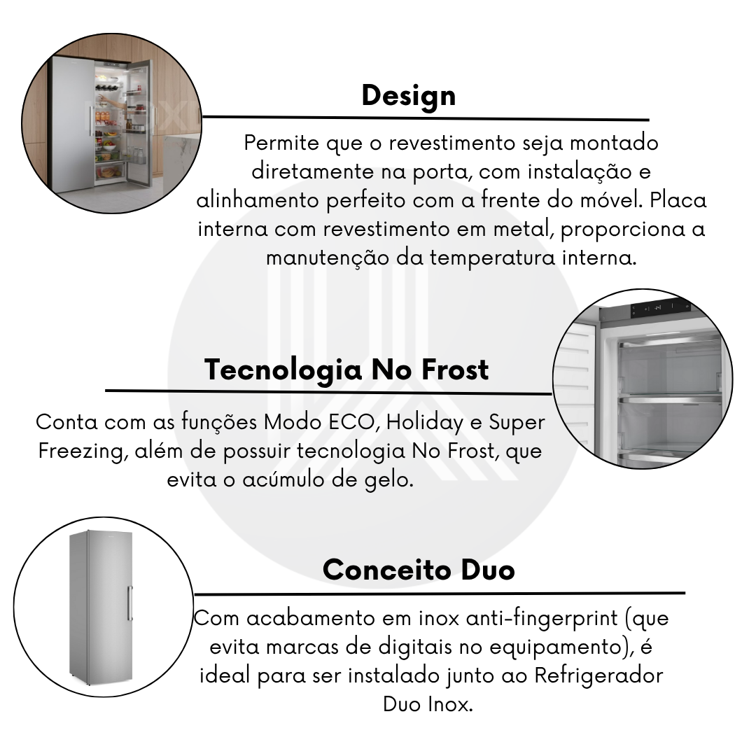 Design de Luxo (Conceito Duo): O design Inox Anti-Fingerprint que combina perfeitamente com o Refrigerador Duo (404L) resolve a demanda por um visual side-by-side, imponente e unificado.