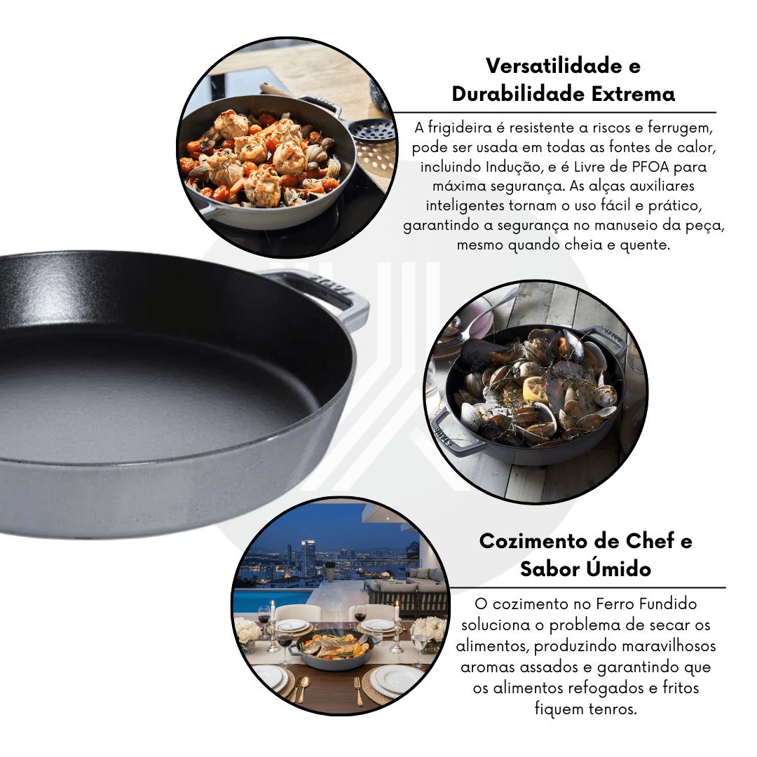 A Frigideira Redonda STAUB de 34 cm com Duas Alças é o utensílio essencial que une a tradição centenária do Ferro Fundido com a performance da cozinha moderna. A STAUB, uma marca francesa renomada, é sinônimo de legado de excelência e oferece um investimento duradouro para sua cozinha de alto padrão.
