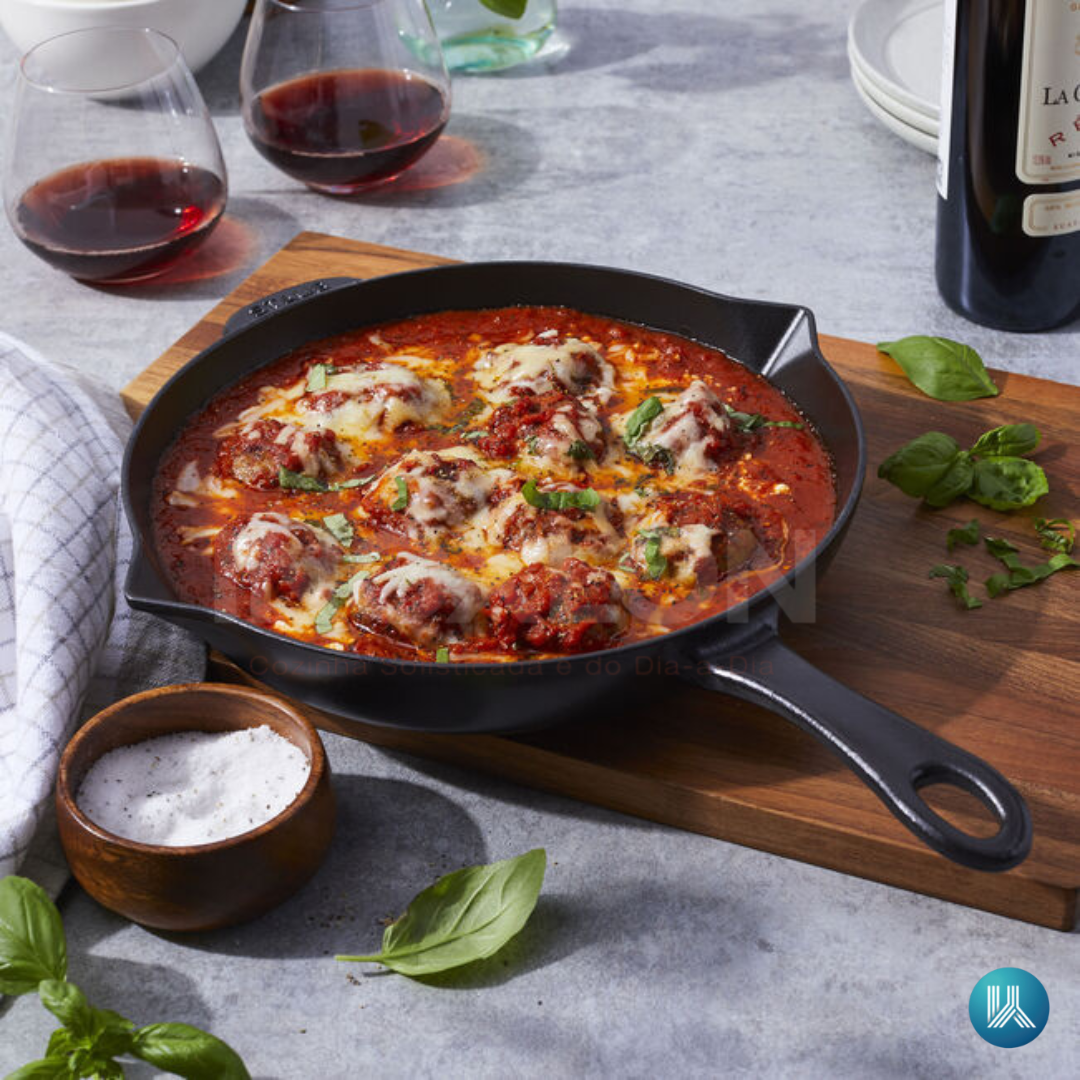 Dicas de Cuidados e Manutenção: As peças de Ferro Fundido Esmaltado STAUB são conhecidas por sua durabilidade extrema. Lave à utilizando água morna e detergente neutro logo após o uso. É crucial evitar terminantemente o uso de produtos abrasivos, alvejantes, saponáceos ou palha de aço, pois estes danificam o esmalte preto fosco.