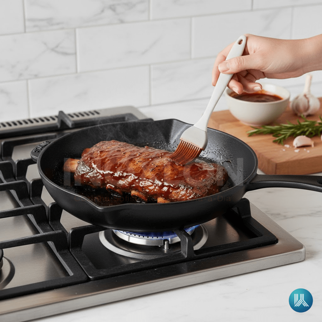 Estabilidade Térmica (Sem Queda de Temperatura): O Ferro Fundido garante distribuição de calor constante e uniforme, resolvendo a dificuldade da temperatura da panela cair ao adicionar o alimento.