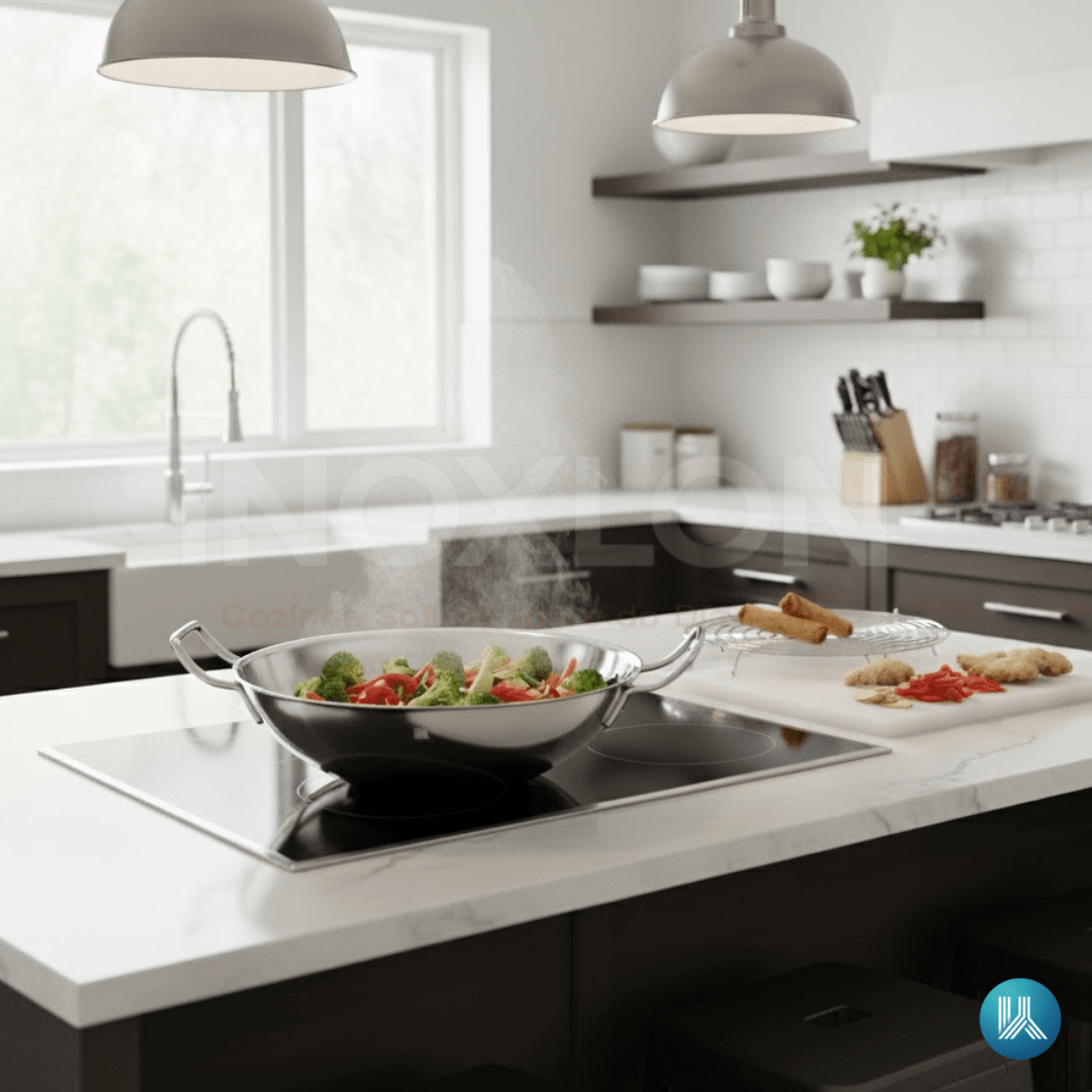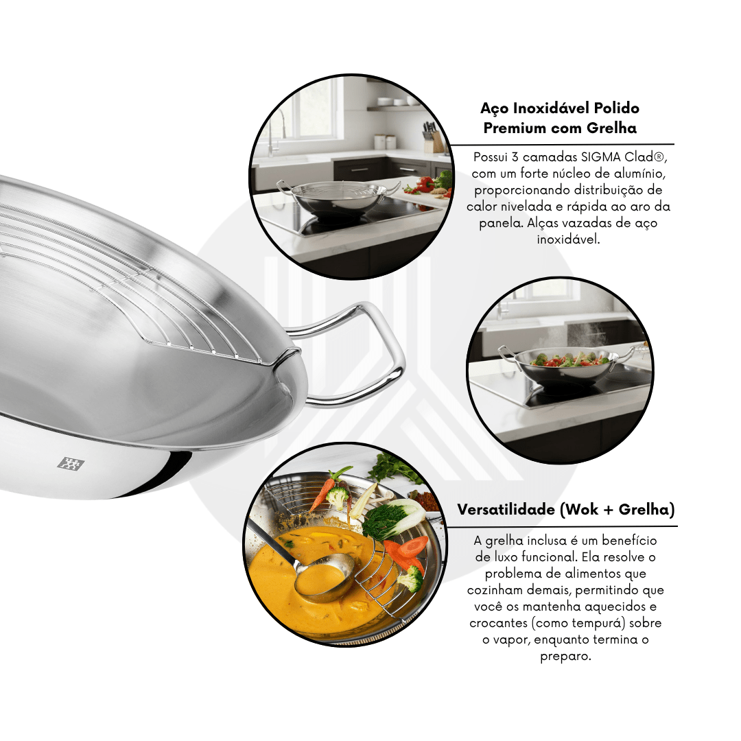 Versatilidade (Wok + Grelha): A grelha inclusa é um benefício de luxo funcional. Ela resolve o problema de alimentos que cozinham demais, permitindo que você os mantenha aquecidos e crocantes (como tempurá) sobre o vapor, enquanto termina o preparo.
