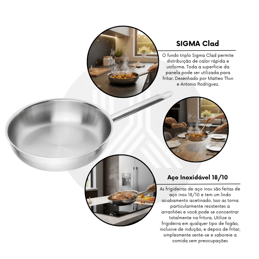 Fabricada em Aço Inoxidável 18/10 com um sofisticado acabamento acetinado, ela combina estética de luxo com alta resistência a arranhões. A tecnologia SIGMA Clad é o coração desta frigideira: um robusto núcleo de alumínio distribui o calor de forma rápida e perfeitamente uniforme, não apenas no fundo, mas até a borda, permitindo o uso total da superfície para fritar.
