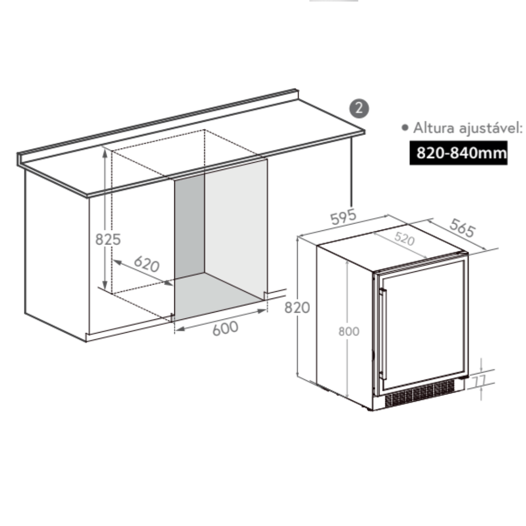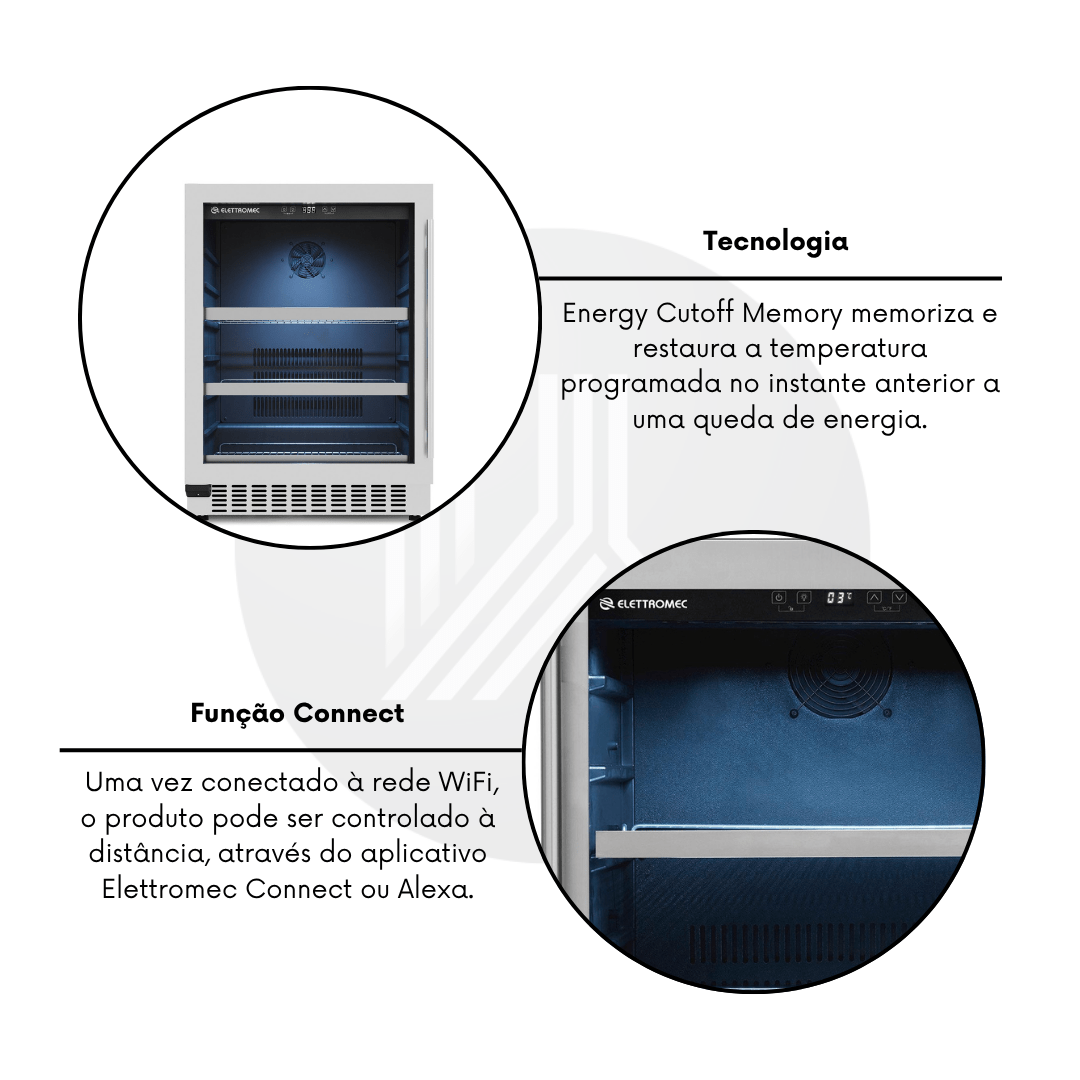 O grande diferencial é a Função Connect (Wi-Fi), que permite controlar o frigobar à distância através do aplicativo Elettromec Connect ou por comandos de voz com a Alexa. O controle é preciso graças ao comando digital e ao termostato eletrônico, que permitem ajustar a temperatura exatamente entre 0°C e 10°C. A iluminação interna em LED realça as bebidas, armazenadas em 3 prateleiras (sendo duas com altura ajustável).