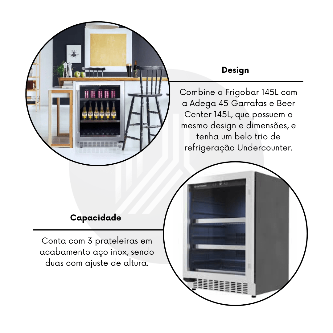 O Frigobar de Embutir Elettromec traz o máximo de tecnologia e sofisticação para sua área gourmet. Com 145 litros de capacidade e design Undercounter (para embutir sob bancadas), ele se destaca pela porta de vidro com moldura em Aço Inoxidável. Seu design permite a combinação perfeita com a Adega 45 Garrafas e o Beer Center 145L, criando um trio de refrigeração uniforme e elegante.