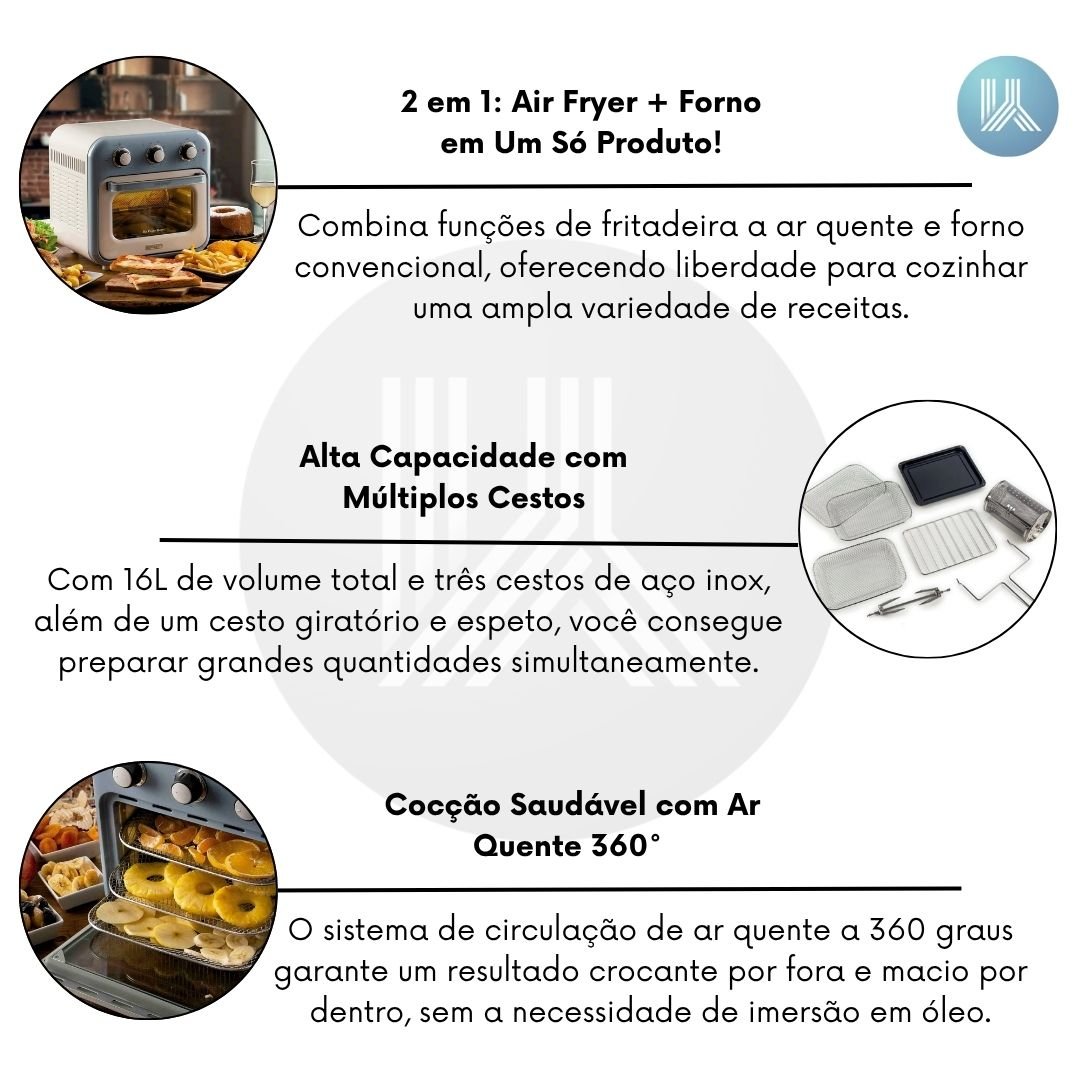 A Air Fryer Vintage Azul conta com ampla capacidade de 16 L, permitindo preparar várias porções simultaneamente. Seus três cestos perfurados, o cesto giratório e o espeto para assar foram desenvolvidos em aço inoxidável de alta resistência, garantindo durabilidade e distribuição uniforme do calor. Ideal para famílias grandes ou para quem gosta de receber convidados com tranquilidade.