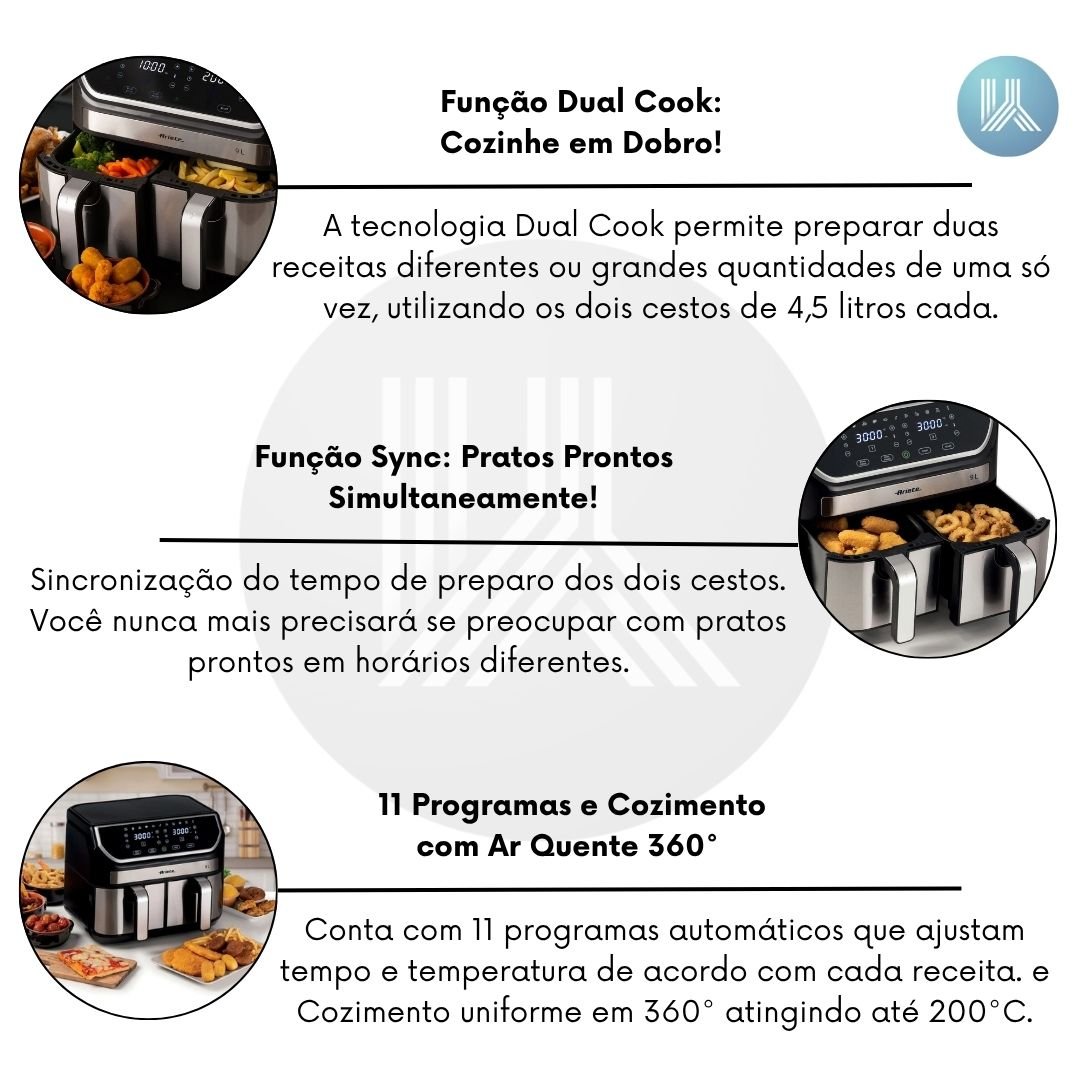 Prepare refeições deliciosas e saudáveis com praticidade e rapidez usando a Fritadeira Air Fryer Dual 9L Metal Ariete 4625. Com design moderno e acabamento em preto e prata, ela é perfeita para famílias grandes ou quem adora receber convidados. Seu sistema com dois cestos independentes e funções inteligentes garante resultados incríveis, com crocância por fora e sabor irresistível por dentro — tudo isso com o mínimo de óleo.