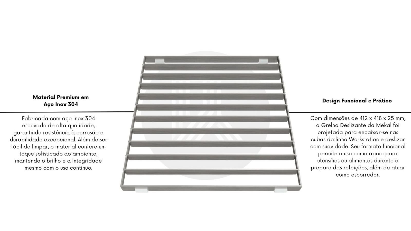 Design Funcional e Prático: Com dimensões de 412 x 418 x 25 mm, a Grelha Deslizante da Mekal foi projetada para encaixar-se nas cubas da linha Workstation e deslizar com suavidade. Seu formato funcional permite o uso como apoio para utensílios ou alimentos durante o preparo das refeições, além de atuar como escorredor. Um produto pensado para oferecer organização e eficiência ao seu espaço.