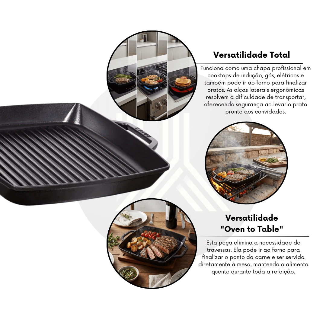 O grande diferencial deste utensílio premium é a sua performance térmica. O ferro fundido distribui o calor de forma eficiente e gradativa, permitindo atingir altas temperaturas sem ressecar os alimentos. As estrias da grelha, combinadas com o interior em esmalte preto fosco, criam marcas de grelha perfeitas e caramelizam o alimento, garantindo aromas assados maravilhosos e uma refeição mais saudável, pois a gordura escorre para os sulcos. O design inclui alças auxiliares inteligentes, facilitando o manuseio seguro do fogão para o forno (resistente até 250°C) e direto para a mesa. Compatível com todas as fontes de calor, incluindo indução.