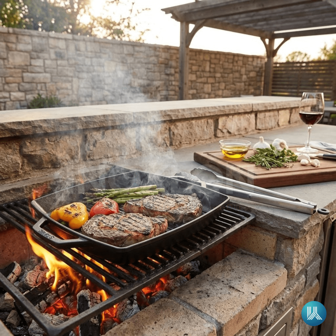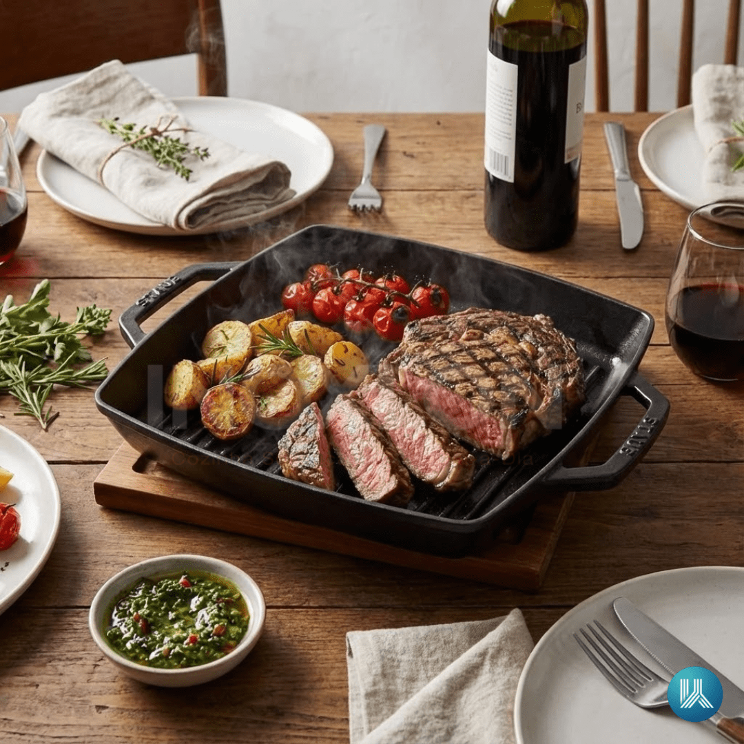 O Grelhado Perfeito (Indoor): O ferro fundido premium retém calor intenso, solucionando o problema de "cozinhar em vez de grelhar". Ele sela a carne instantaneamente, mantendo o interior suculento e criando um sabor autêntico de churrasco.