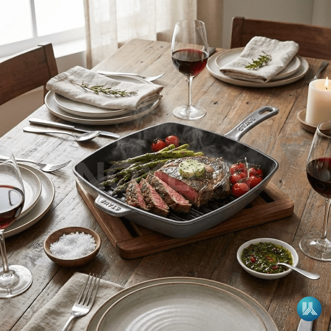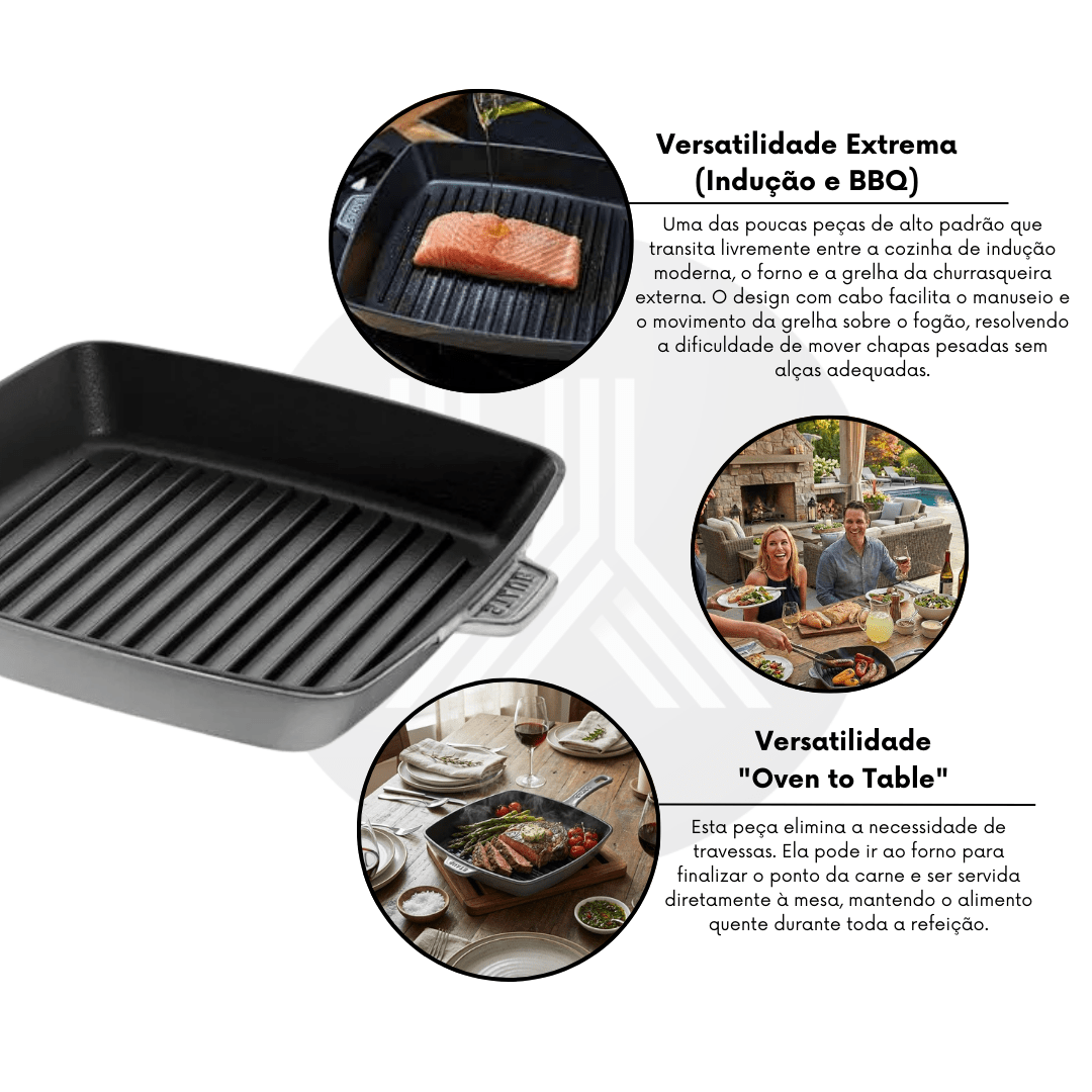 Versatilidade Extrema (Indução e BBQ): Uma das poucas peças de alto padrão que transita livremente entre a cozinha de indução moderna, o forno e a grelha da churrasqueira externa.