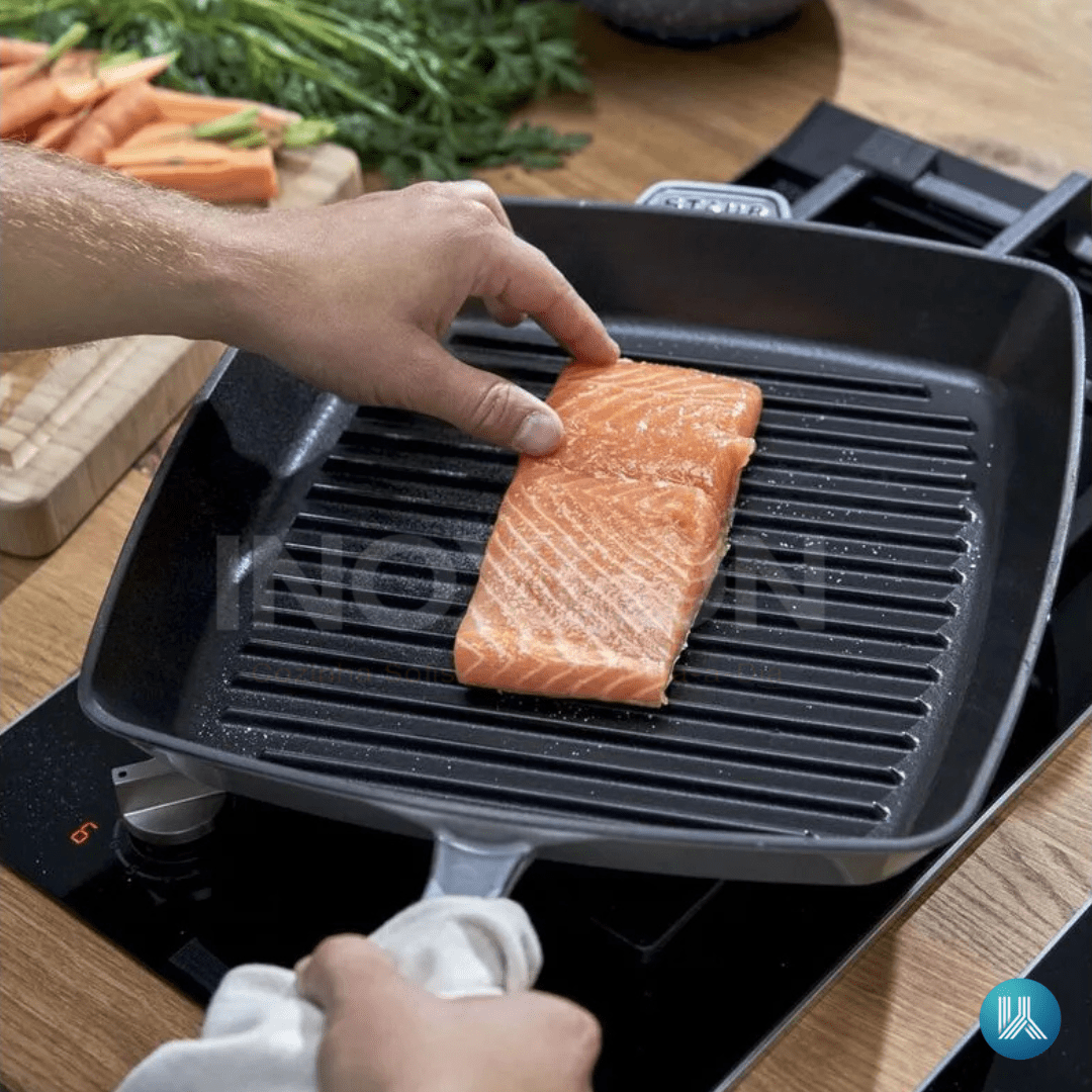 A Grelha Americana Quadrada STAUB de 26 cm na cor Cinza Grafite é a ferramenta definitiva para quem deseja replicar o sabor e a aparência de um churrasco profissional no conforto de casa. Produzida na França, esta peça de alto padrão combina a retenção de calor superior do Ferro Fundido Esmaltado com um design prático de cabo longo auxiliar, facilitando o manuseio como uma frigideira robusta. Sua superfície nervurada (estriada) foi projetada para criar marcas de grelha profundas e caramelizadas (reação de Maillard), garantindo não apenas um visual de luxo, mas um sabor defumado autêntico.