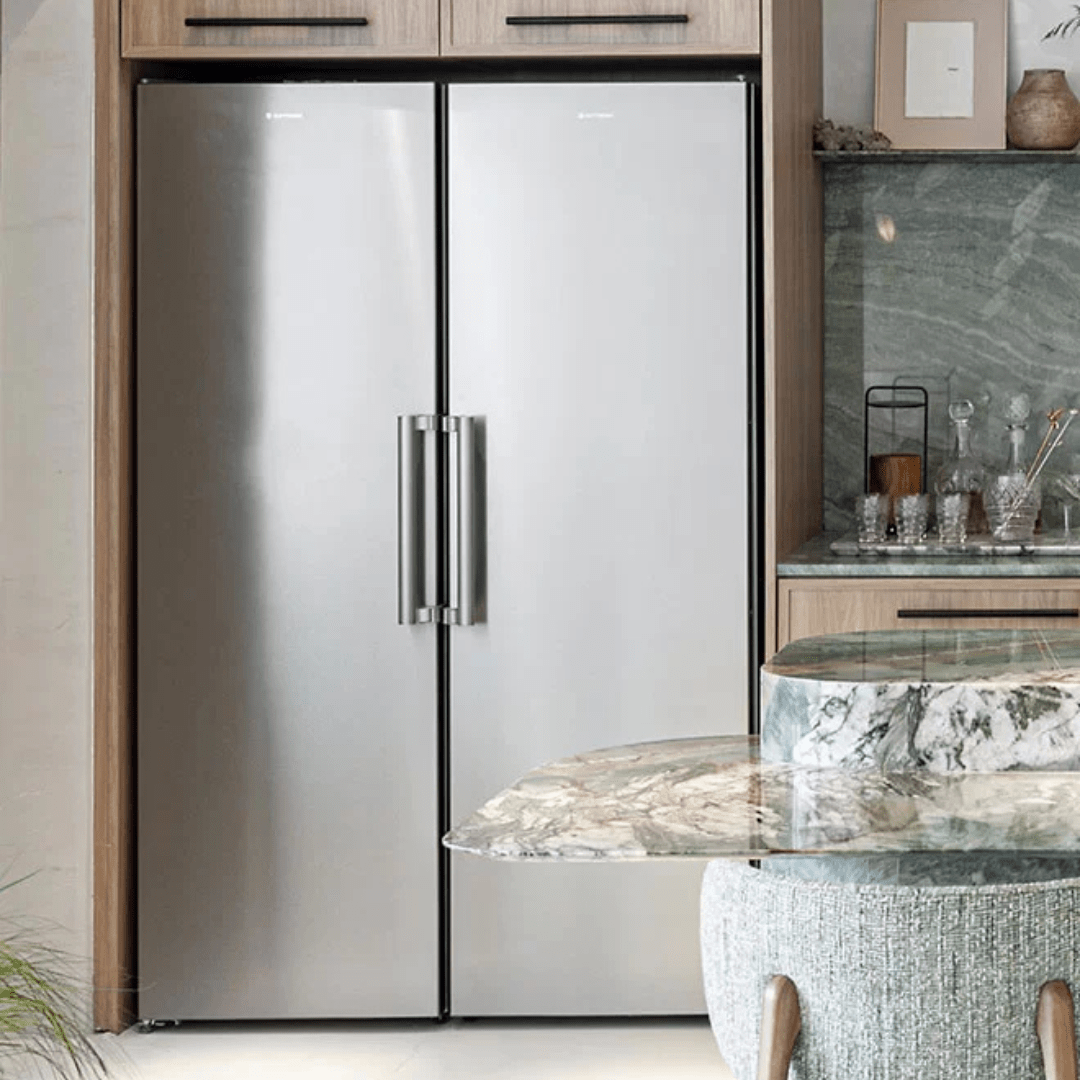 O conceito Duo da Elettromec permite instalar refrigerador e freezer lado a lado, criando um conjunto imponente de mais de 700 litros de capacidade. O acabamento em inox Anti-Fingerprint com linhas minimalistas garante sofisticação ao ambiente, enquanto a iluminação LED interna e prateleiras cromadas trazem praticidade e elegância para cozinhas modernas e áreas gourmet planejadas.