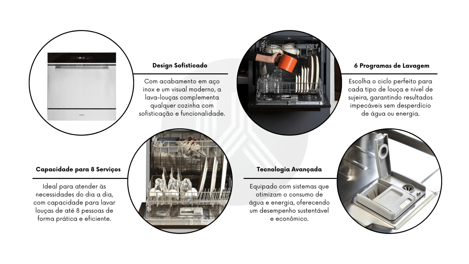 Capacidade para 8 Serviços: Compacta por fora, mas espaçosa por dentro. Ideal para atender às necessidades do dia a dia, com capacidade para lavar louças de até 8 pessoas de forma prática e eficiente.