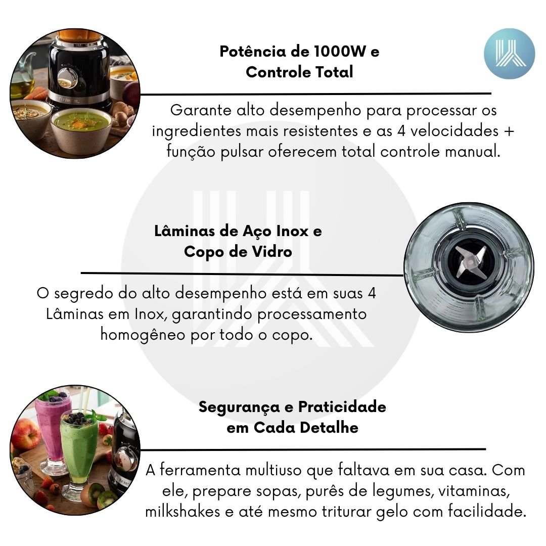 O segredo do alto desempenho está em suas 4 Lâminas de Aço Inox Duráveis, sendo duas voltadas para baixo e duas para cima, garantindo um sistema de rotação que processa os alimentos de maneira homogênea por todo o copo. Aliado ao Copo de Vidro Graduado 1,5L, que é resistente a variações de temperatura e odores, você tem a combinação perfeita para durabilidade, segurança e resultados superiores em suas receitas.