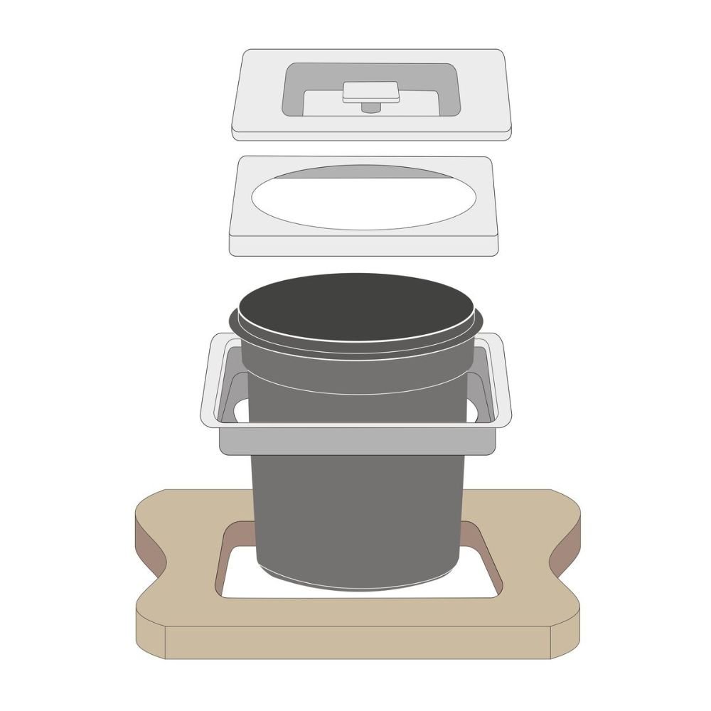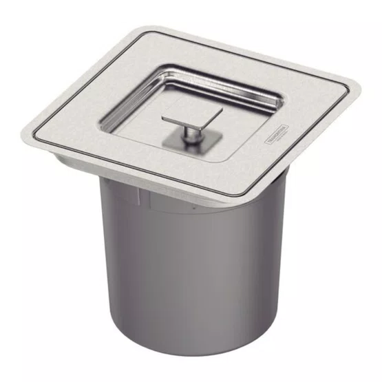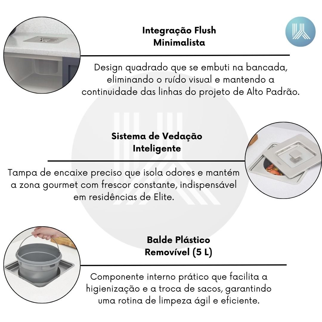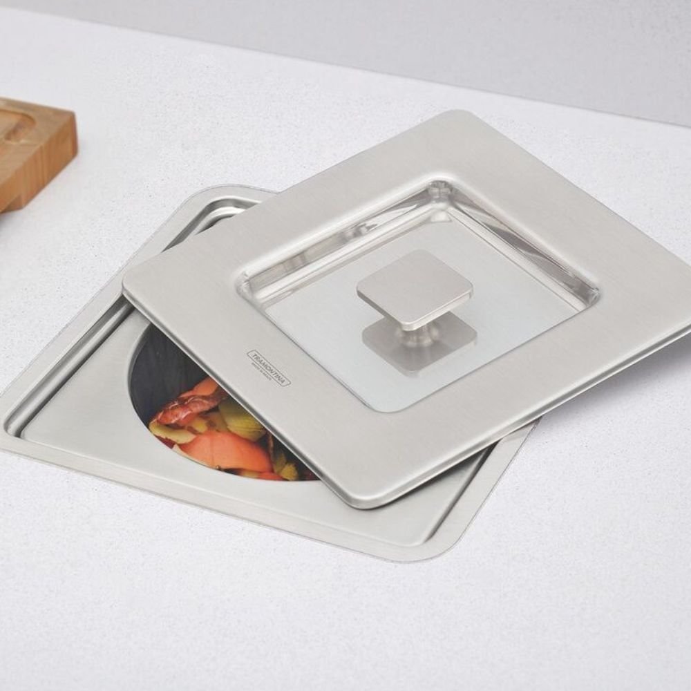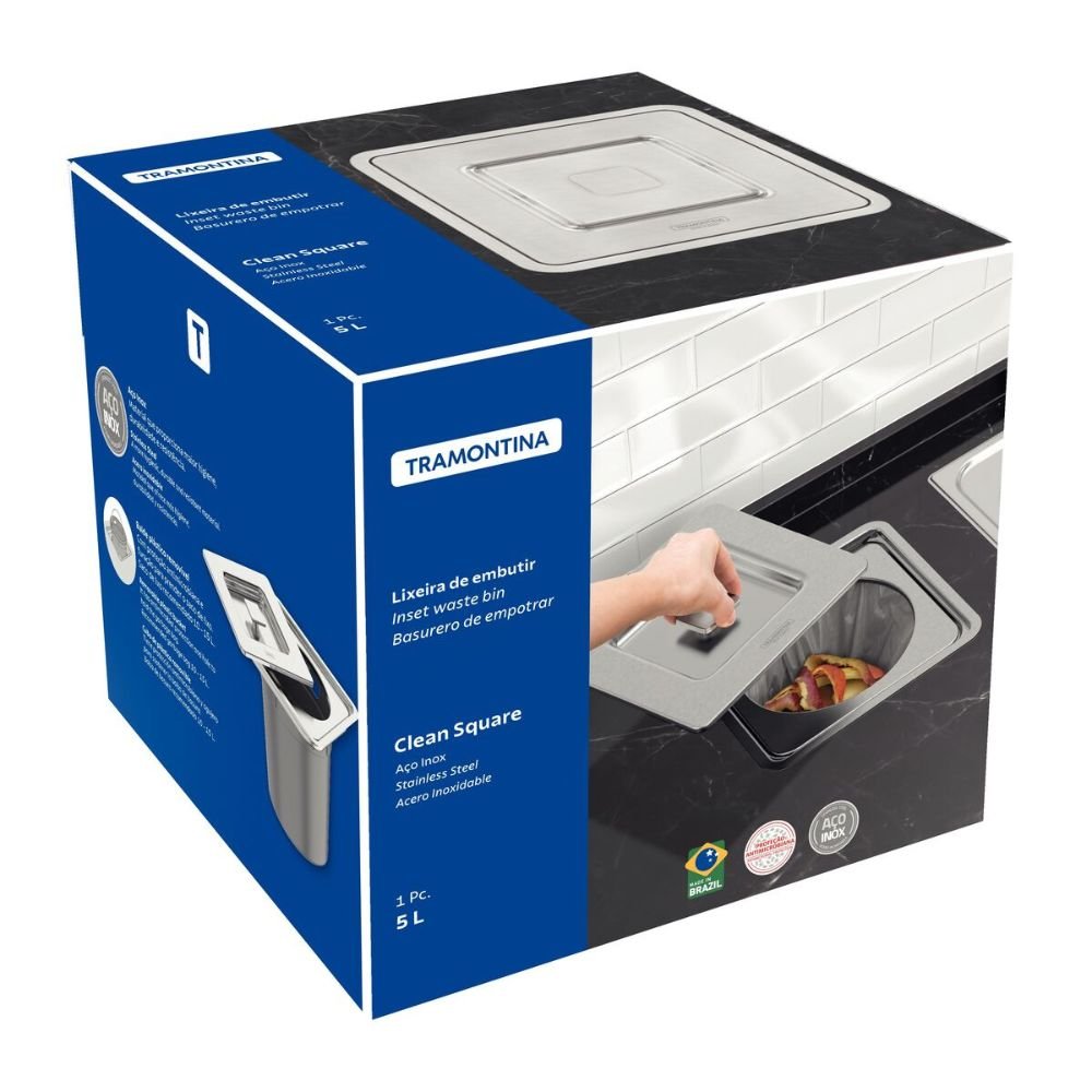 Em um projeto de Luxo, a harmonia visual da bancada não deve ser interrompida por elementos utilitários expostos. O uso de lixeiras convencionais sobre a pia ou no piso fragmenta o design e compromete a sofisticação do ambiente, além de facilitar a dispersão de odores indesejados. A Lixeira de Embutir Tramontina Clean Square é a solução definitiva para este problema. Ao integrar-se perfeitamente à pedra, ela oculta os resíduos e mantém a superfície de trabalho livre de obstruções, entregando uma Performance Semi-profissional que une higiene absoluta e pureza estética.