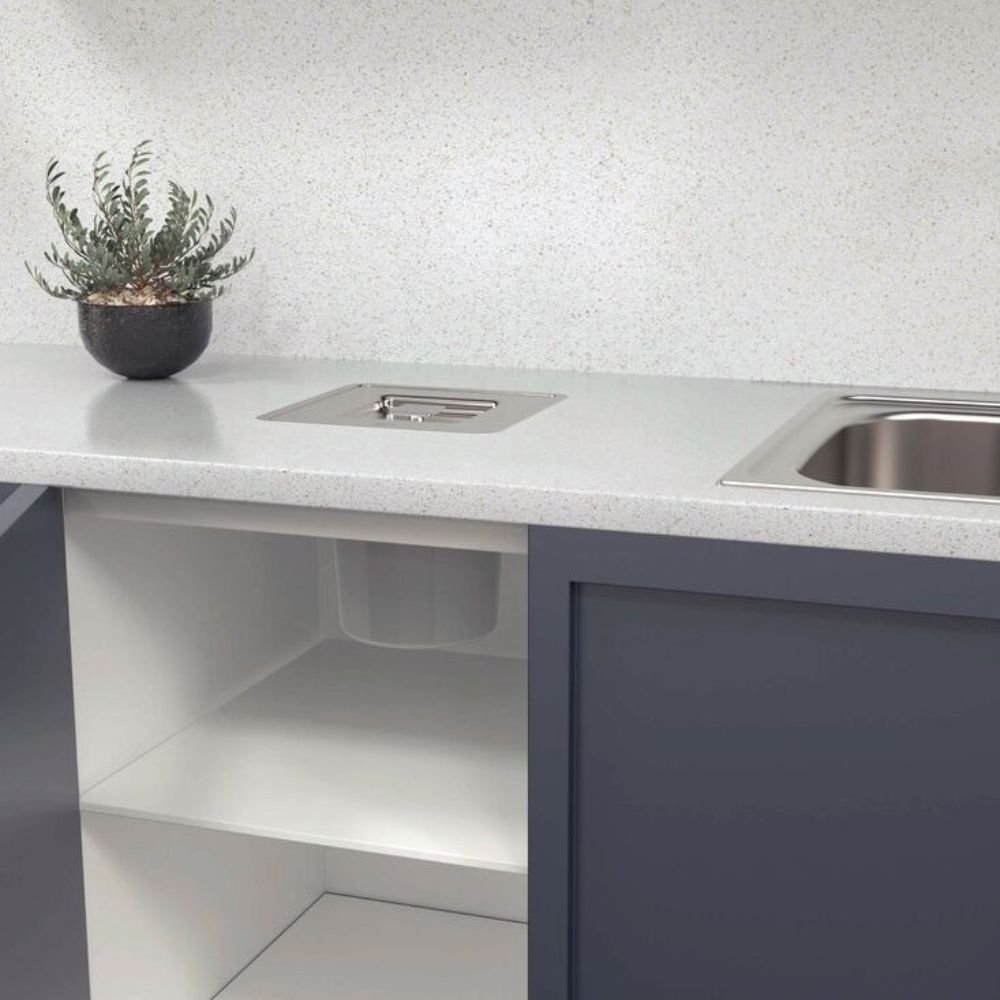 Libera a área da pia para o preparo de alimentos, transformando a gestão de resíduos em um processo discreto e funcional.