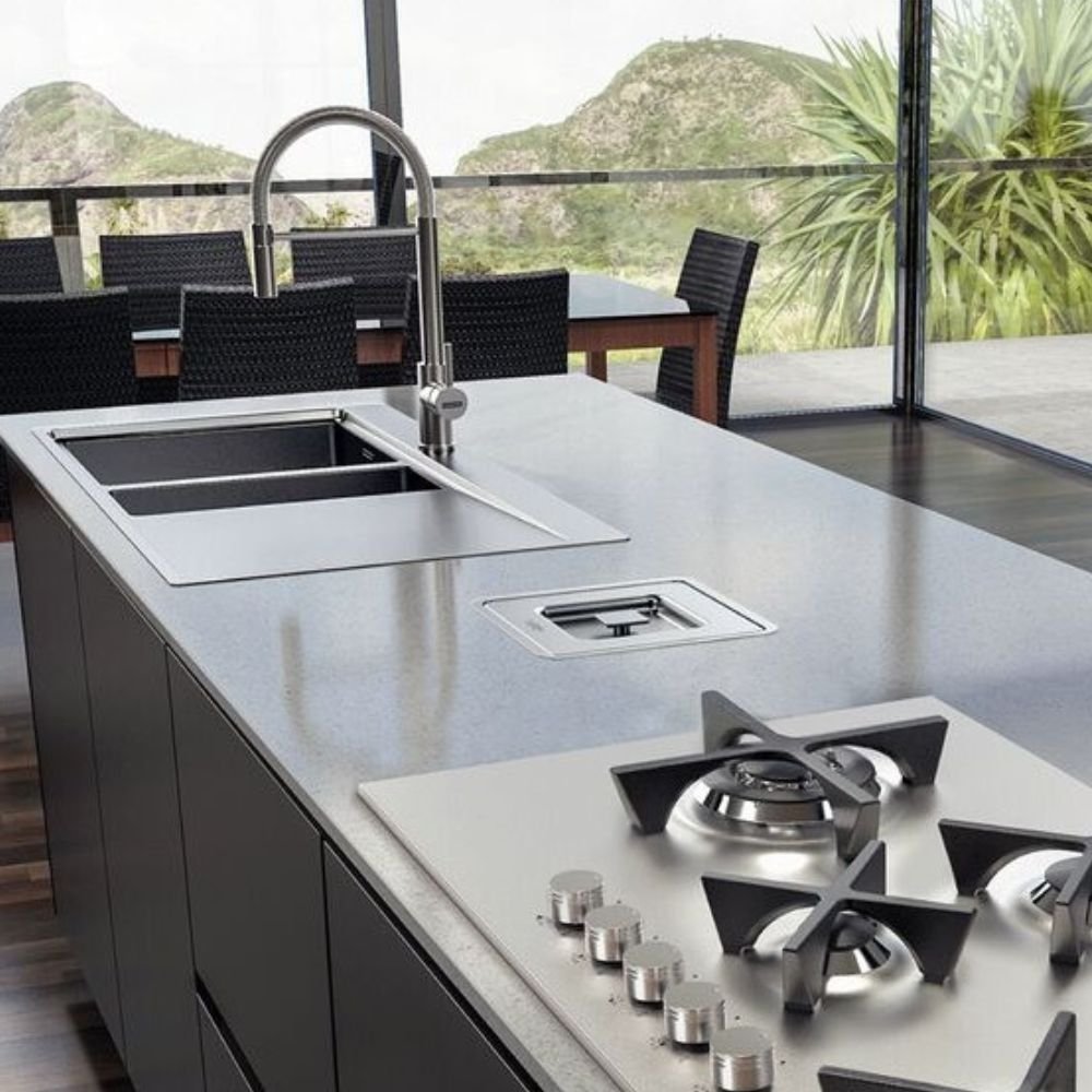 Design quadrado que se embuti na bancada, eliminando o ruído visual e mantendo a continuidade das linhas do projeto de Alto Padrão.