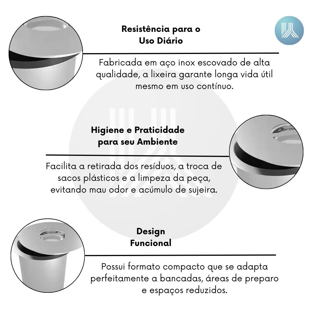 Fabricada em aço inox escovado de alta qualidade, a lixeira garante longa vida útil mesmo em uso contínuo. O material é conhecido por sua resistência à corrosão, facilidade de limpeza e acabamento elegante que combina com qualquer estilo de cozinha. Esse diferencial assegura um produto confiável, pensado para suportar a rotina intensa da sua casa.