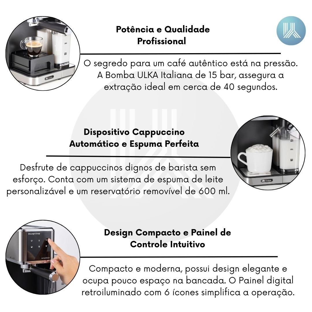 A Máquina de Café Espresso Ariete 1397 Ametista é a união perfeita de design elegante, funcionalidade de ponta e dimensões compactas, ideal para quem busca café de cafeteria no conforto do seu lar. Equipada com a potente Bomba ULKA Italiana de 15 bar, ela garante um espresso perfeito com crema e aroma intensos. Seu painel de controle fácil de usar, com display touch screen, permite que você prepare sua bebida favorita com apenas um clique. Além de ser compatível com café espresso moído e sachês, ela ainda conta com um sistema de organização inteligente.