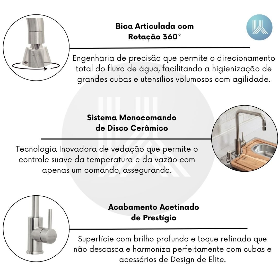 Engenharia de precisão que permite o direcionamento total do fluxo de água, facilitando a higienização de grandes cubas e utensílios volumosos com Sofisticação e agilidade.