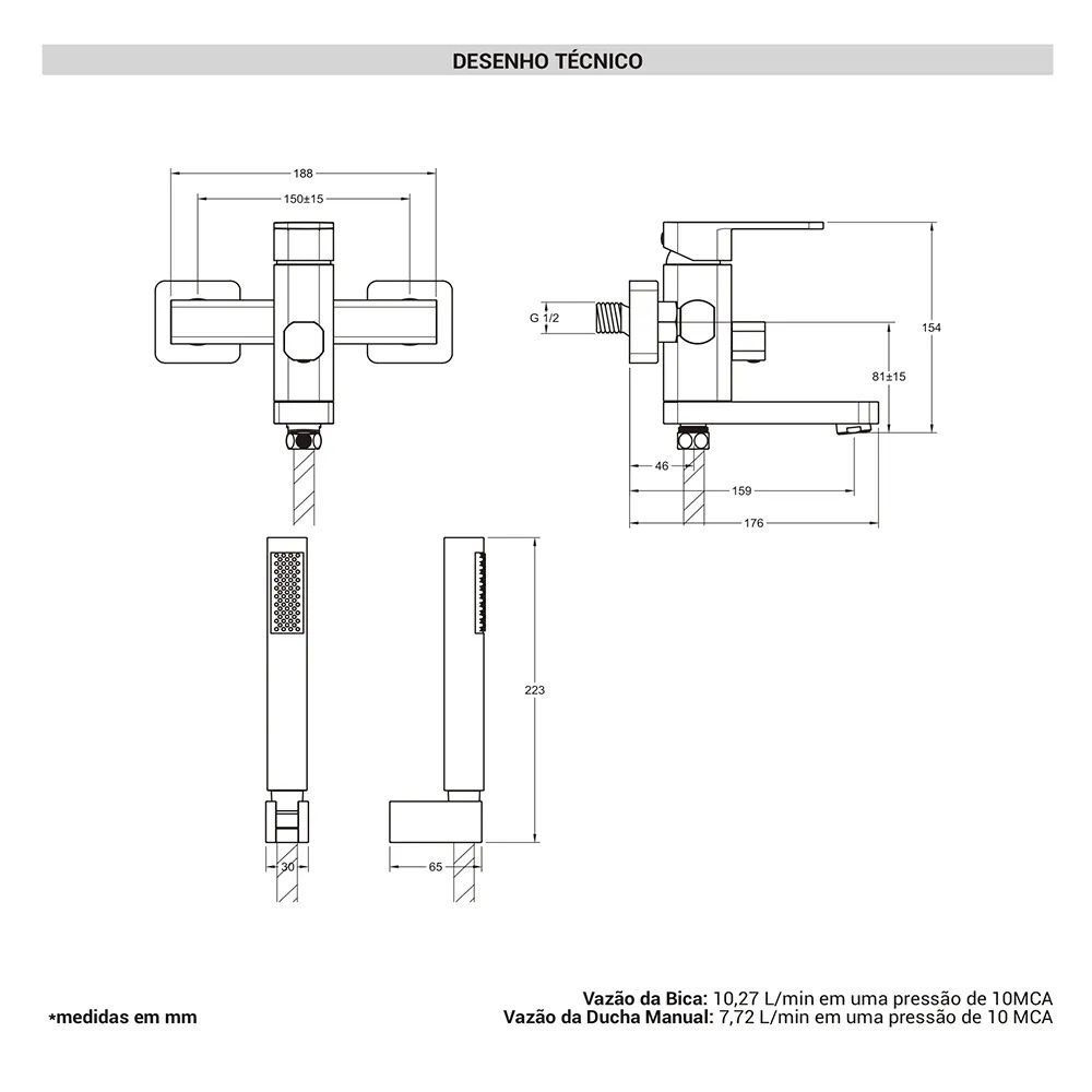 | Vazão da Ducha Manual | 7,72 L/min em uma pressão de 10MCA |