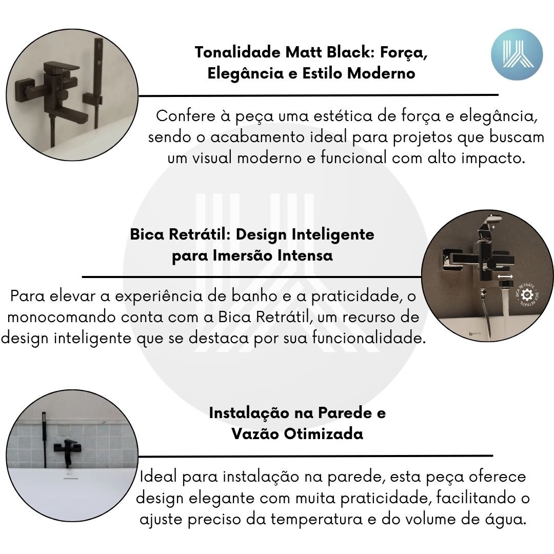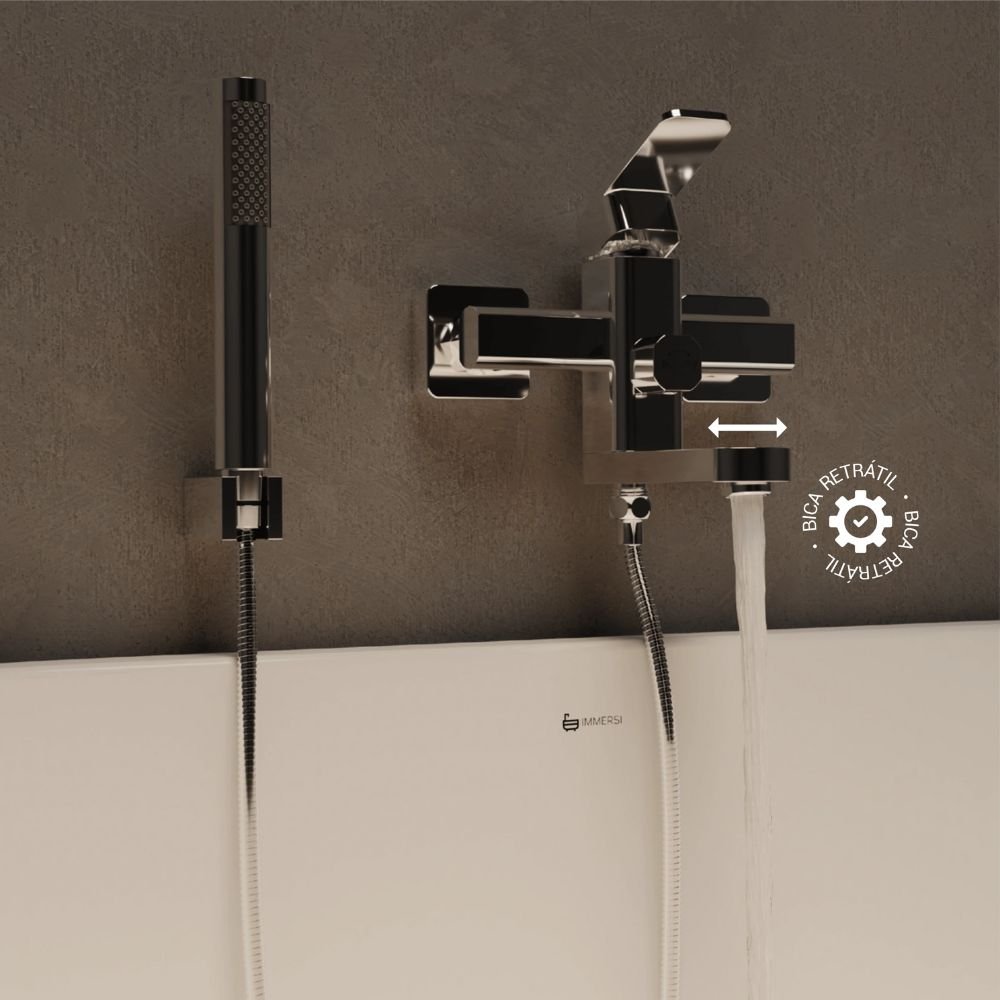 Para elevar a experiência de banho e a praticidade, o monocomando conta com a Bica Retrátil, um recurso de design inteligente que se destaca por sua funcionalidade: ela se estende para o enchimento rápido da banheira e se retrai de forma discreta, adicionando estilo sem comprometer as linhas clean da parede.