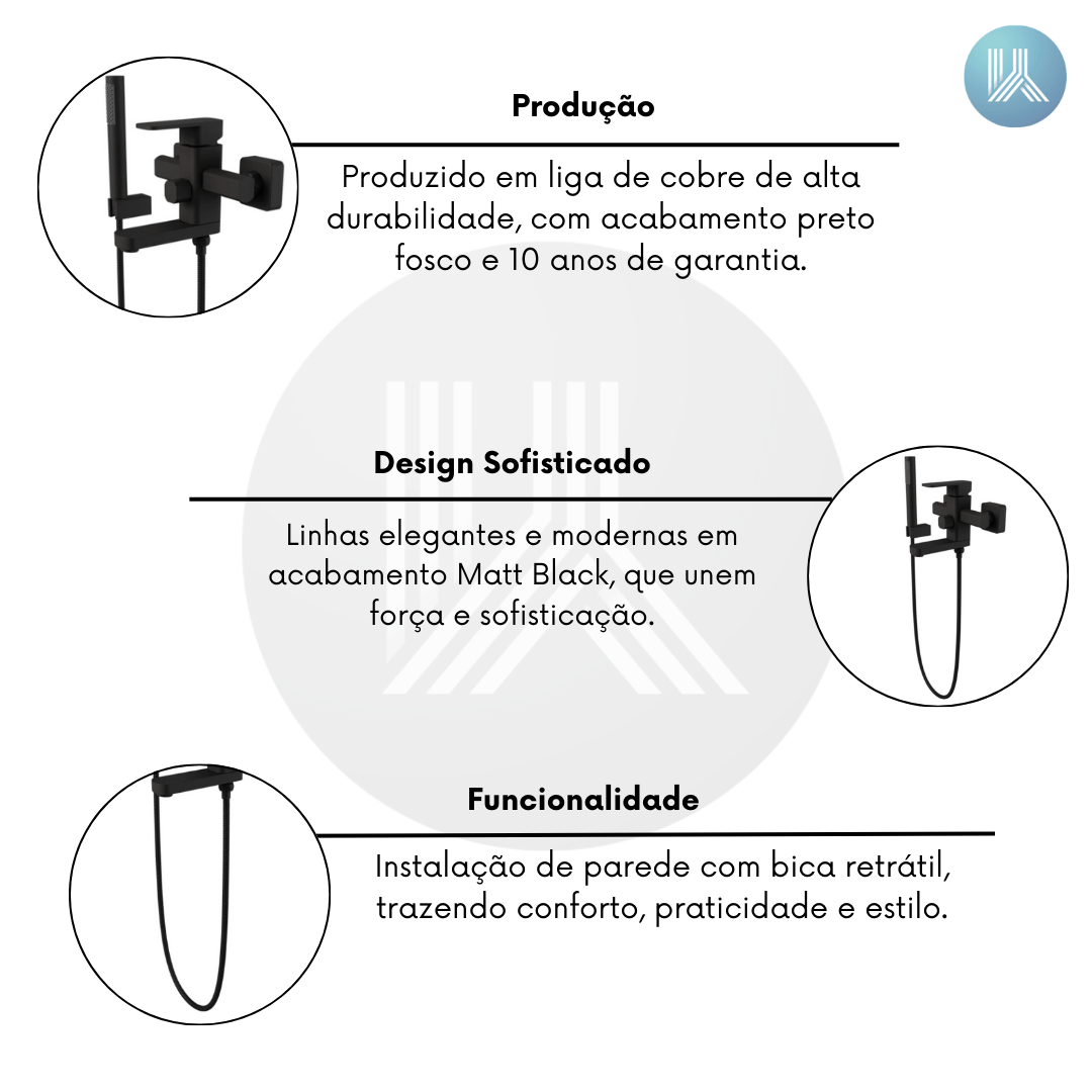 A tonalidade Matt Black transmite força, elegância e personalidade, tornando o monocomando um verdadeiro destaque em salas de banho exclusivas. Produzido em liga de cobre de alta durabilidade e acabamento preto fosco de última geração, oferece resistência e qualidade incomparáveis, acompanhado de 10 anos de garantia.
