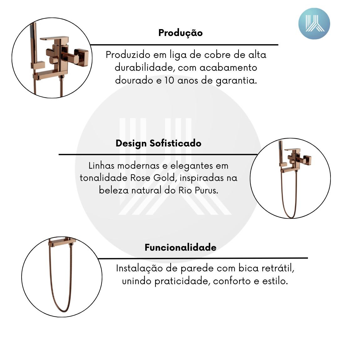 Com detalhes inspiradores e design elegante, o Monocomando de Parede para Banheira Purus Rose Gold é a escolha certa para quem busca unir praticidade, beleza e conforto em uma única peça.