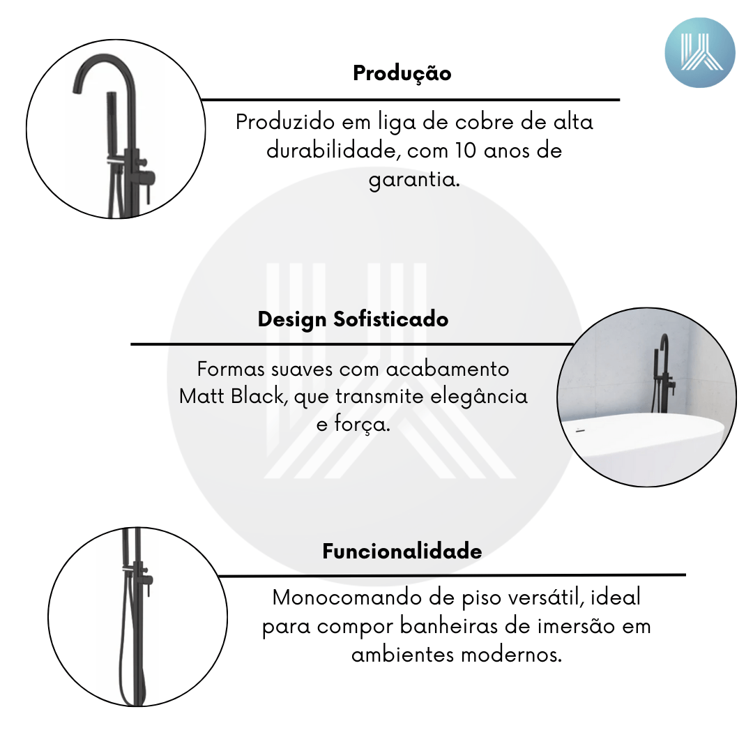 O Monocomando de Piso para Banheira Amazon Matt Black é a escolha perfeita para quem busca unir design moderno, robustez e sofisticação em salas de banho exclusivas. Suas formas suaves e arredondadas criam uma estética versátil e elegante, capaz de transformar qualquer ambiente em um espaço de relaxamento e bem-estar.