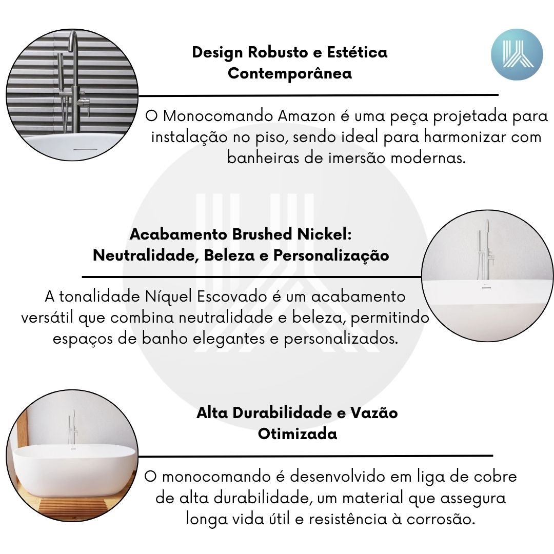 O Monocomando de Piso para Banheira da linha Amazon é uma peça elegante e robusta, com formas suaves e arredondadas, sendo perfeito para compor com banheiras de imersão contemporâneas. Inspirado no Rio Amazonas, o maior em volume de água do mundo, o monocomando foi motivado pela intensa travessia desse recurso natural, carregando sua força e fluidez. Sua tonalidade Brushed Nickel (níquel escovado) possui a capacidade de levar neutralidade e beleza aos ambientes, tornando os espaços de banho ainda mais elegantes e personalizados.