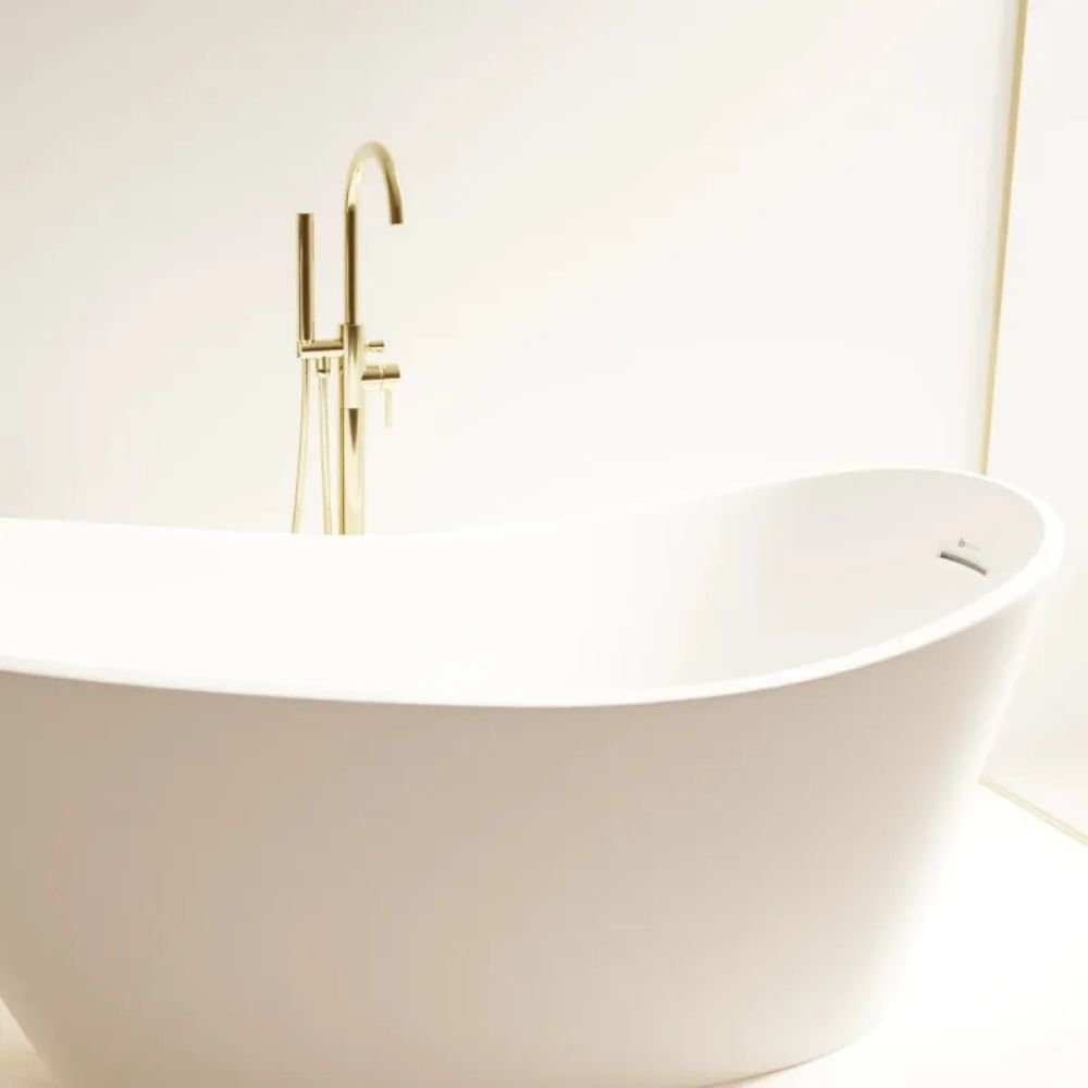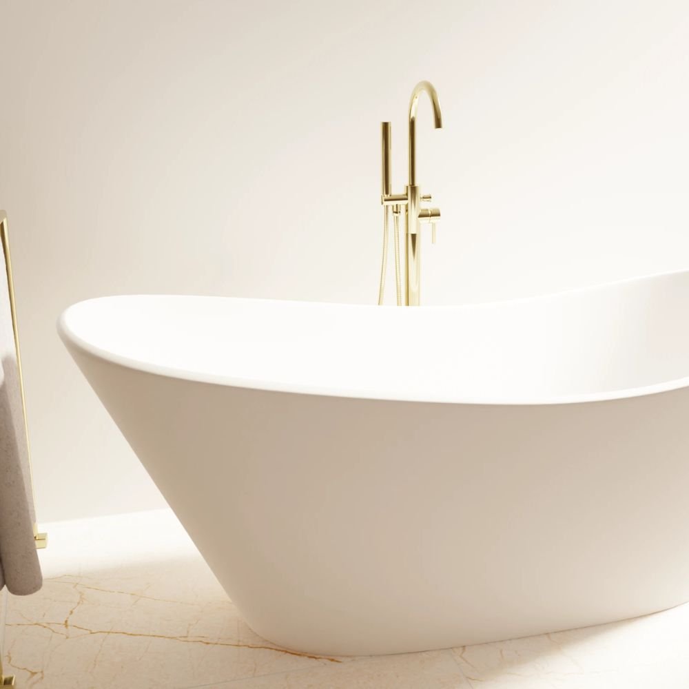 Concebida para instalação no piso ao lado de banheiras de imersão, seu design elegante com formas suaves e arredondadas garante que o metal seja um complemento sofisticado, compondo perfeitamente com a estética de salas de banho contemporâneas.
