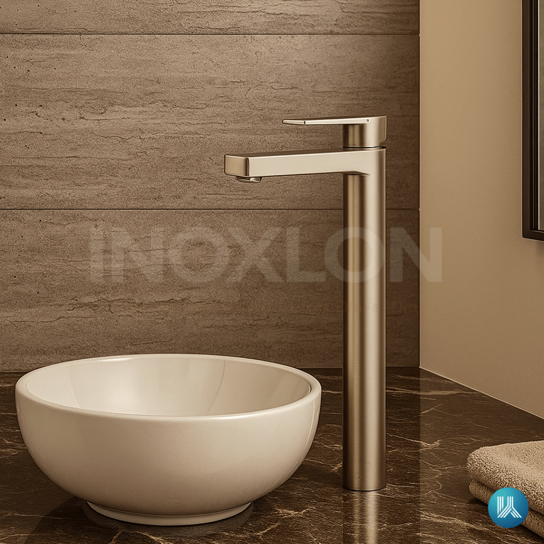 O Monocomando Bica Alta de Mesa Argon é uma verdadeira escultura para o seu lavatório. Com seus traços equilibrados e robustos, ele é a peça central projetada para brilhar em bancadas com Cubas de Apoio, elevando instantaneamente o nível do design com sua silhueta elegante e imponente.