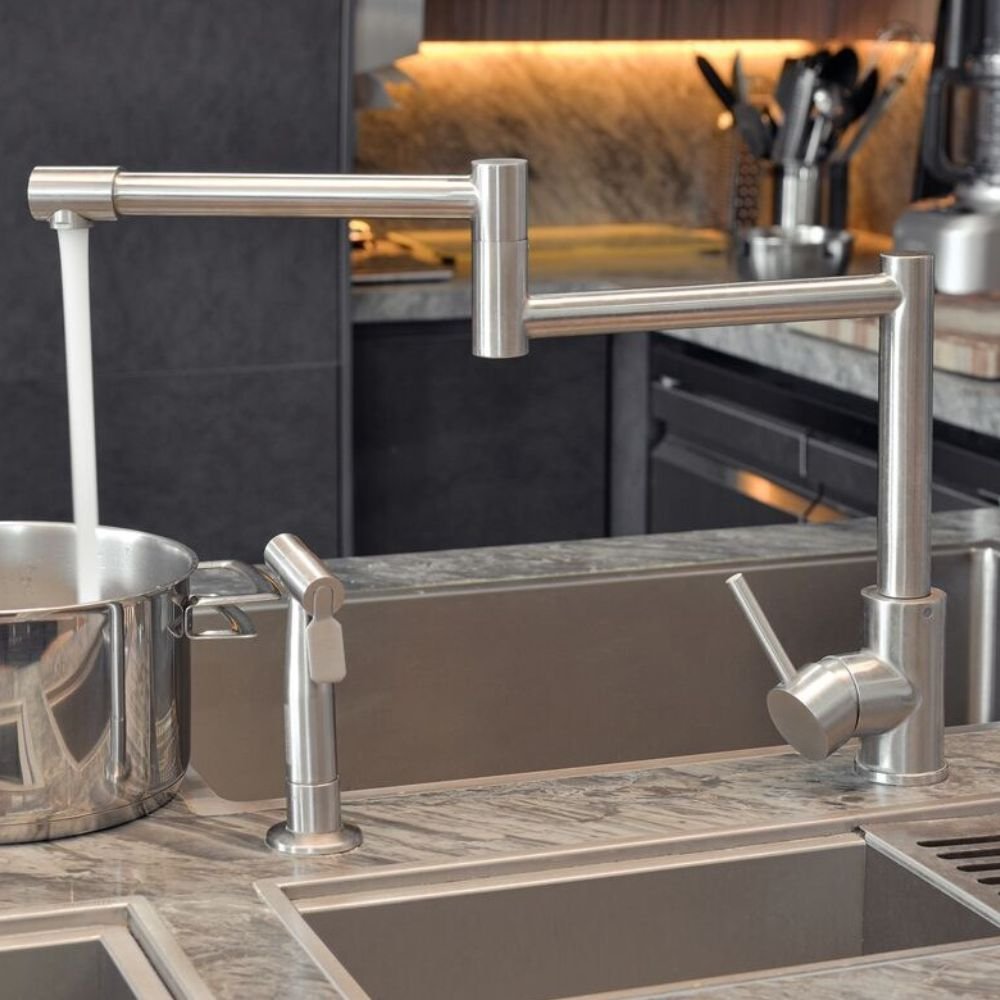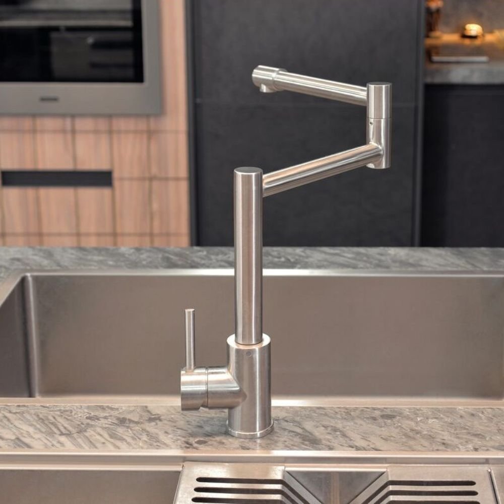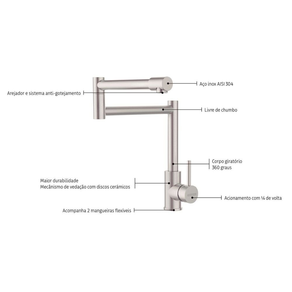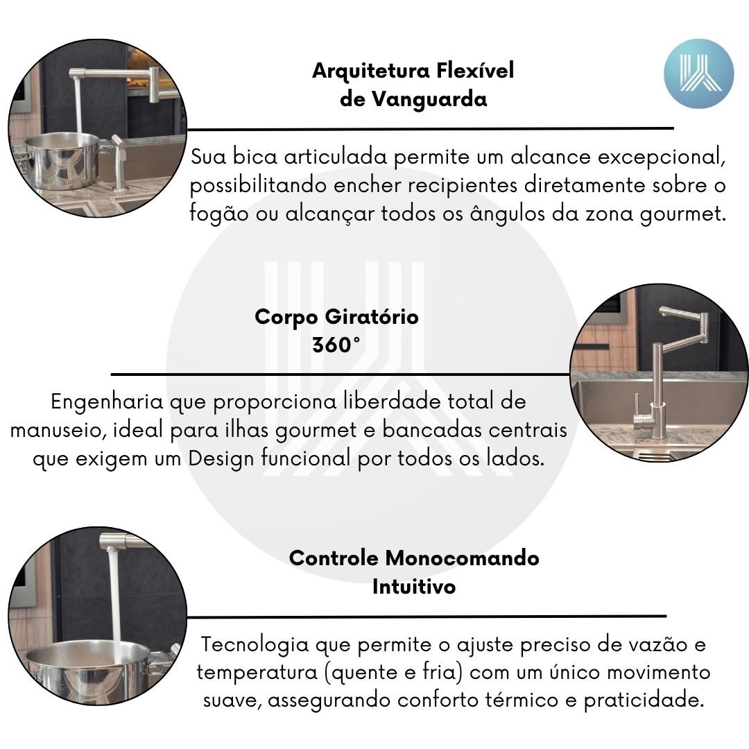 Sua bica articulada permite um alcance excepcional, possibilitando encher recipientes diretamente sobre o fogão ou alcançar todos os ângulos da zona gourmet com precisão Premium.