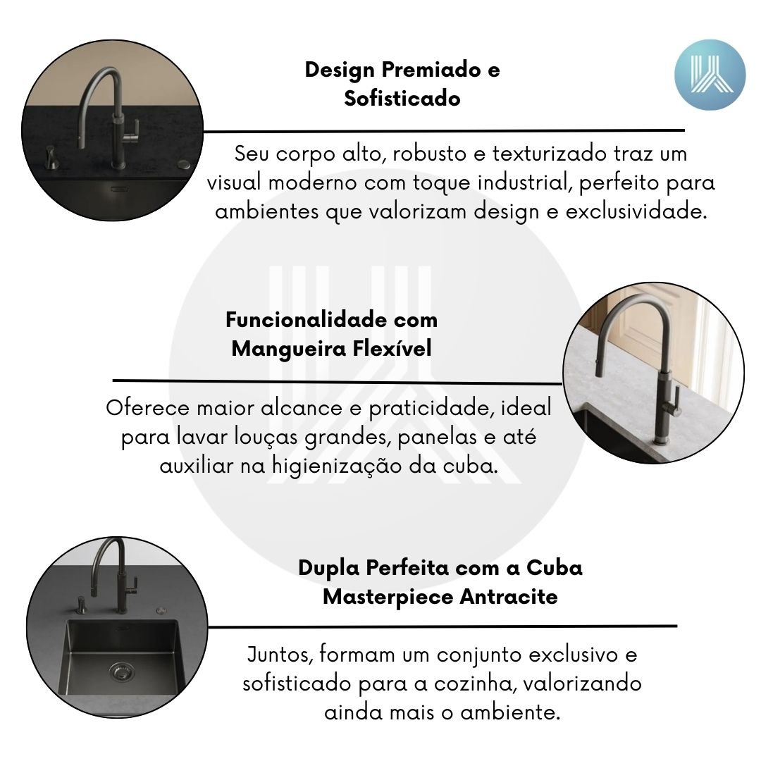 A harmonia entre design e funcionalidade se completa quando combinado com a Cuba Masterpiece Antracite. Juntos, formam um conjunto exclusivo e sofisticado para a cozinha, valorizando ainda mais o ambiente. Esse par traduz estilo, modernidade e praticidade, garantindo uma experiência única para quem busca diferenciação e alto padrão em cada detalhe.
