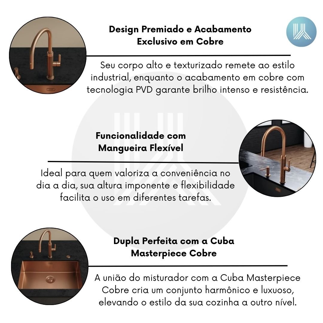A união do misturador com a Cuba Masterpiece Cobre cria um conjunto harmônico e luxuoso, elevando o estilo da cozinha a outro nível. Esse par traduz exclusividade e sofisticação, sendo ideal para quem deseja investir em uma cozinha moderna, funcional e com design diferenciado. Uma escolha que valoriza o espaço e impressiona em cada detalhe.