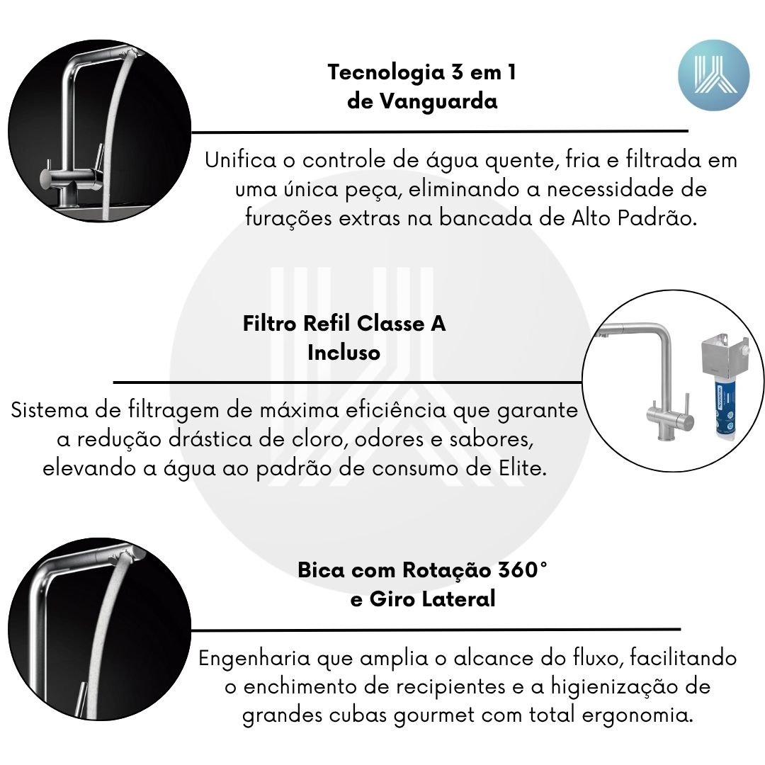 Unifica o controle de água quente, fria e filtrada em uma única peça, eliminando a necessidade de furações extras na bancada de Alto Padrão.