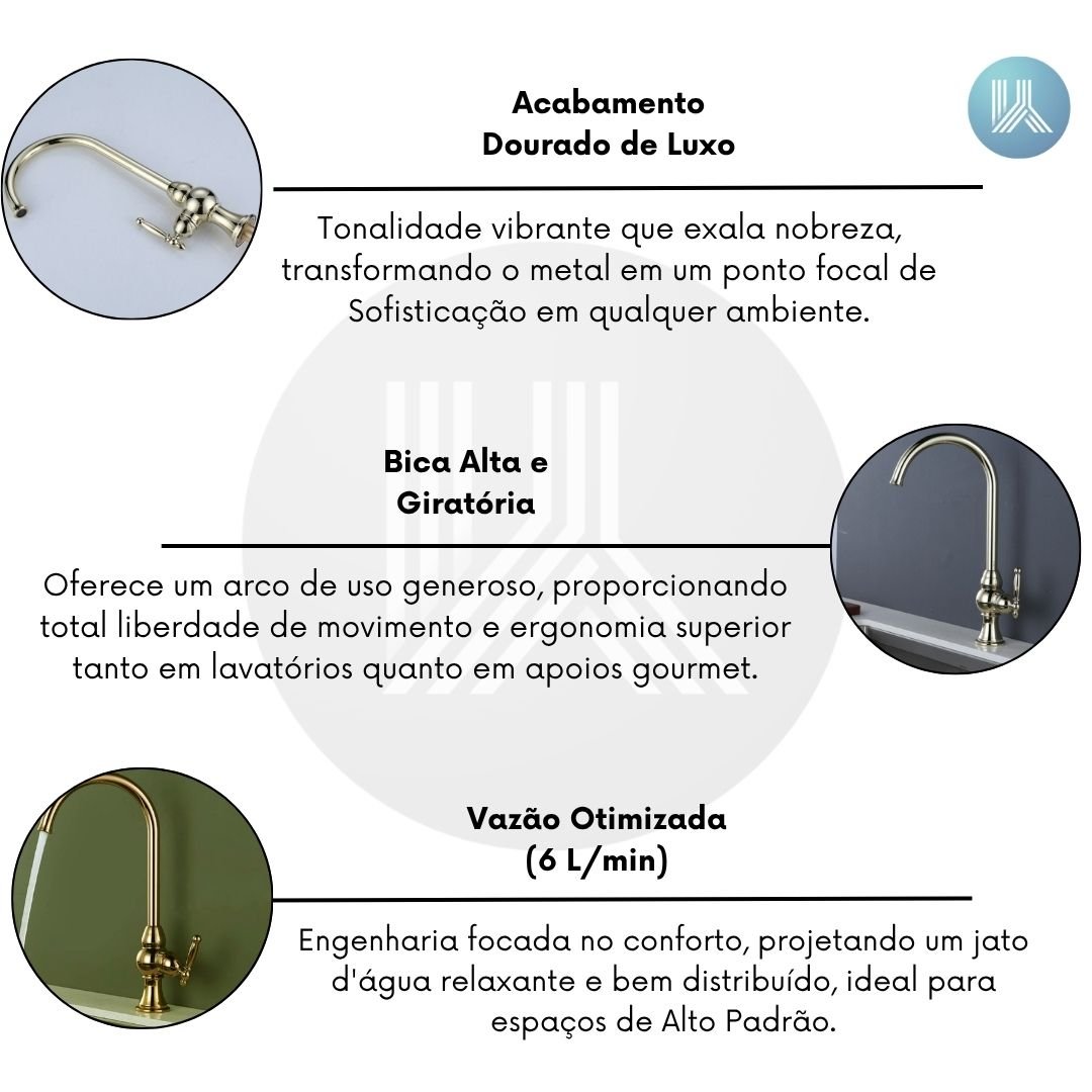 Em projetos de Luxo, a escolha dos metais é o que define o refinamento final da composição. Torneiras convencionais com bicas fixas ou acabamentos que perdem o vigor rapidamente falham em entregar a ergonomia necessária para bancadas modernas, além de não valorizarem o Investimento realizado em pedras nobres. O Misturador Monocomando Classic RB7854 da Rubinettos é a solução definitiva para quem busca protagonismo visual. Com sua bica alta giratória e o resplendor do dourado, ele transforma o uso cotidiano em uma experiência de pura Sofisticação, garantindo que o seu ambiente reflita um status de Elite.