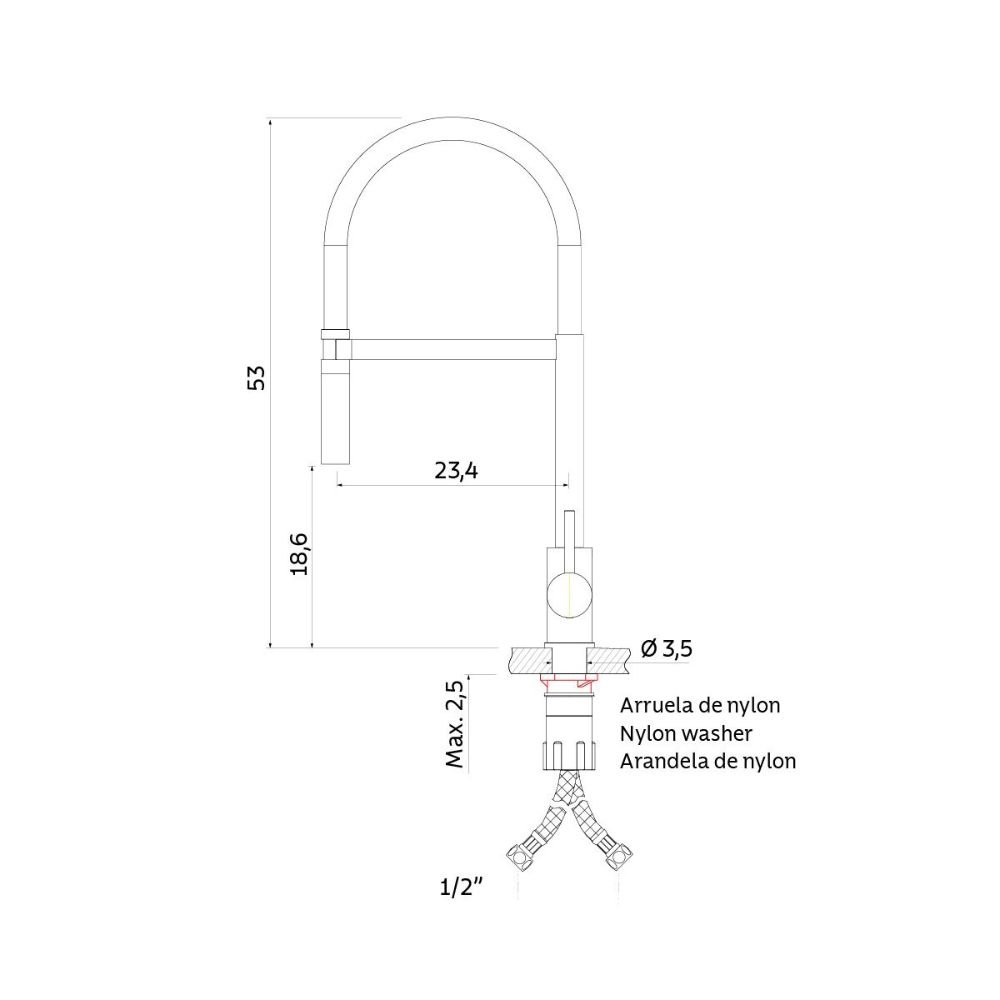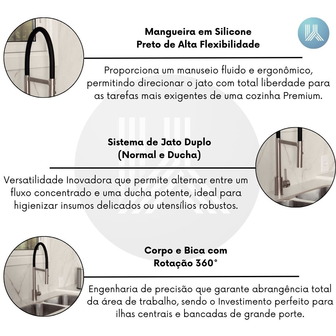 Proporciona um manuseio fluido e ergonômico, permitindo direcionar o jato com total liberdade para as tarefas mais exigentes de uma cozinha Premium.